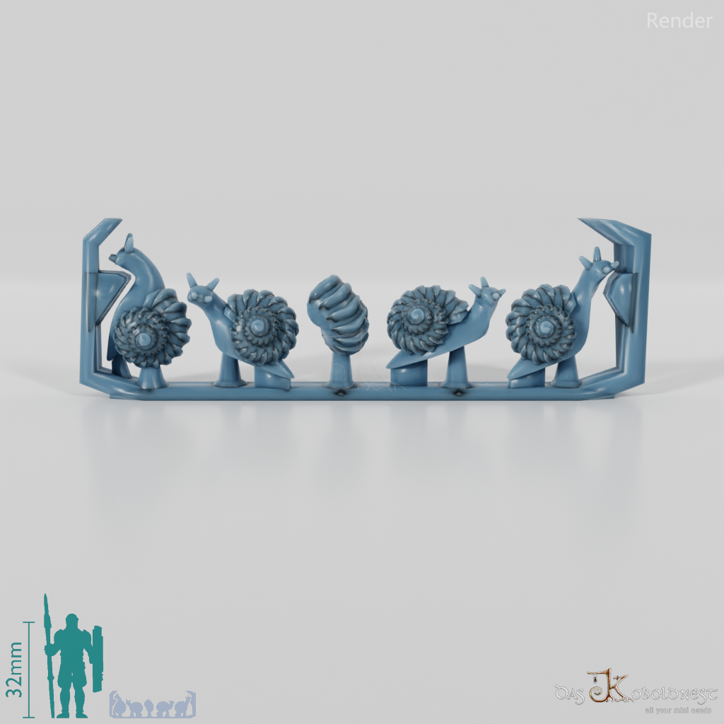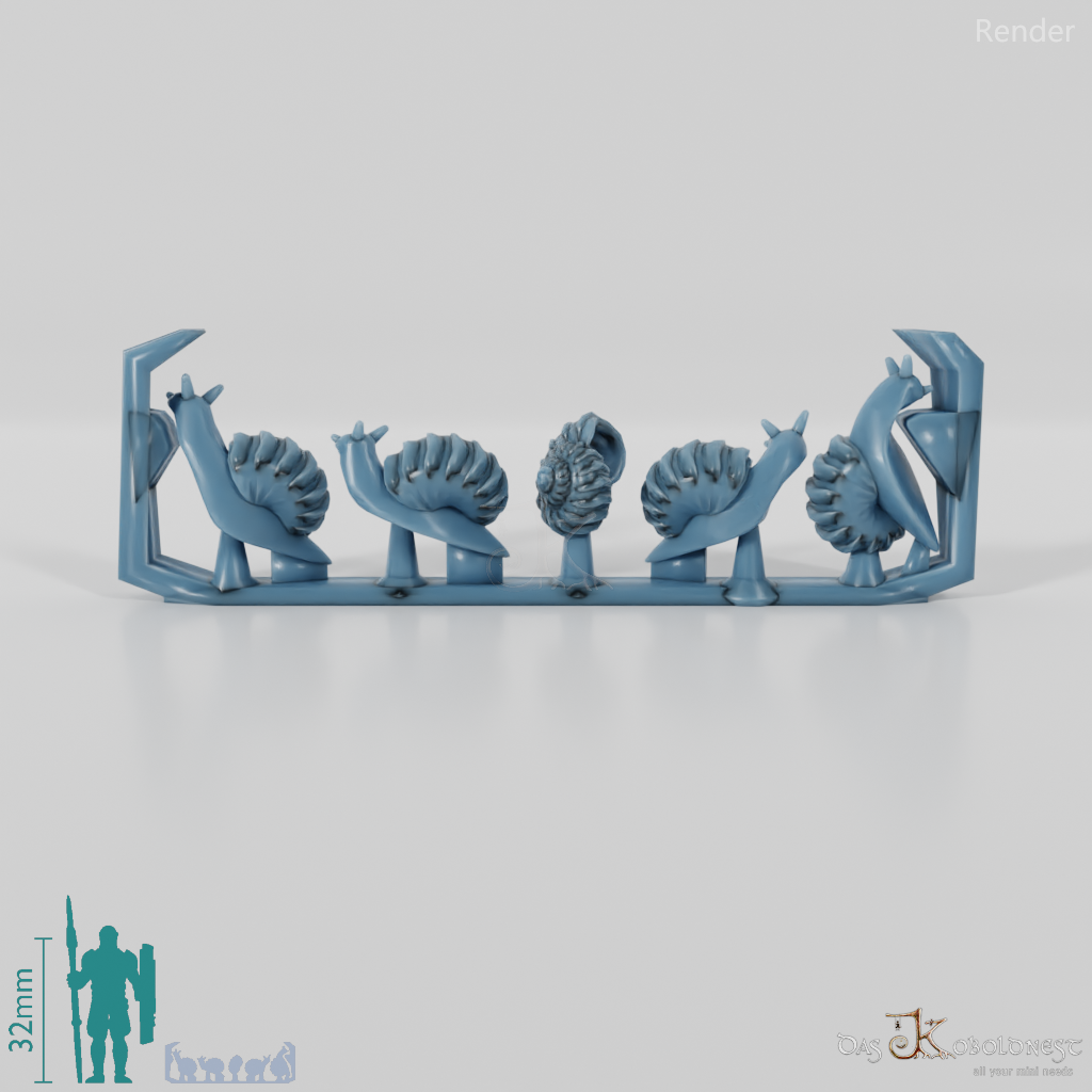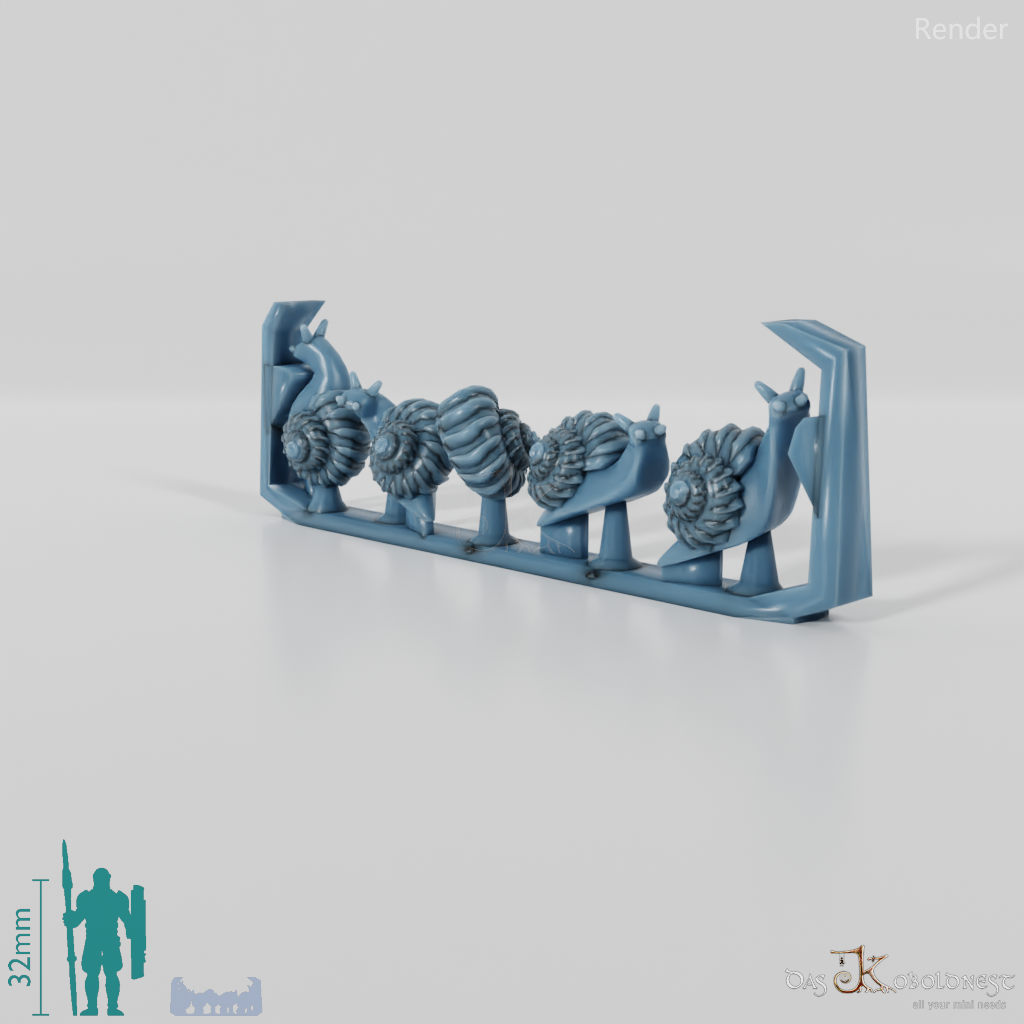Fünf unterschiedliche, kleine Schnecken Die Modelle werden in zusammenhängendem Rahmen geliefert und müssen beispielsweise mit einem Bastelmesser abgetrennt werden. Model by Pellinor1, licensed under CC BY 4.0