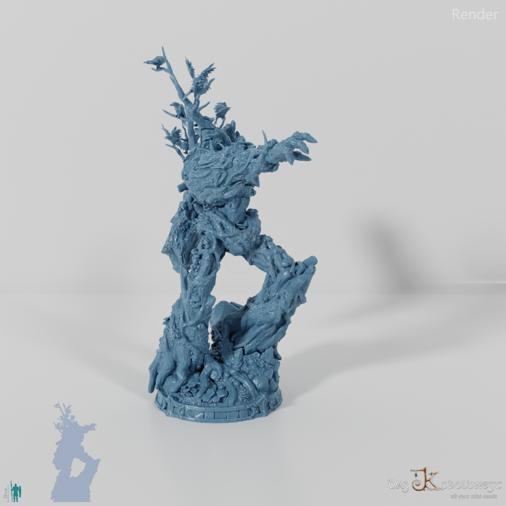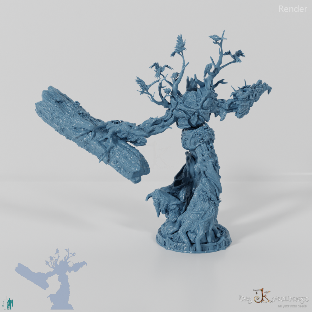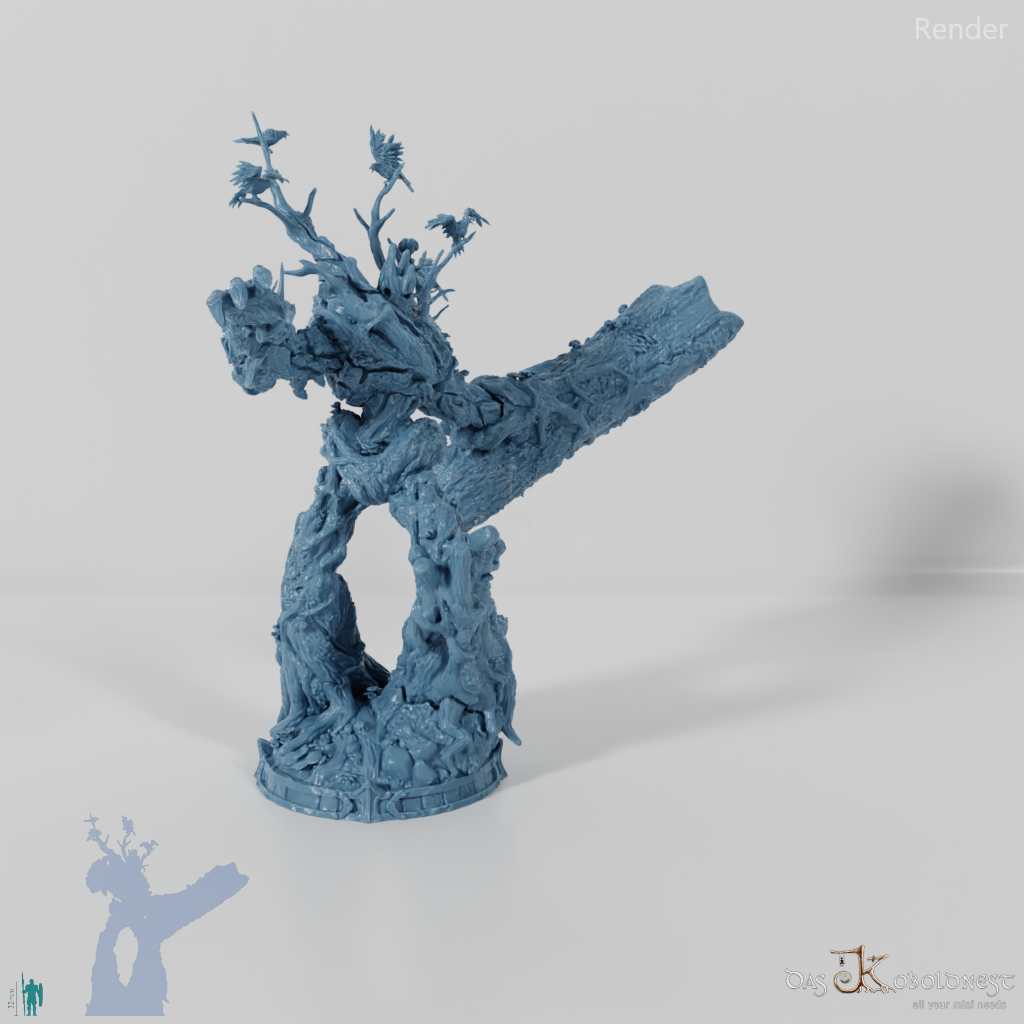 Eindrucksvoller Baumhirte, der mit einer kräftigen Pranke einen massiven Baumstamm ergriffen hat und dem ein Schwarm Krähen auf den Ästen sitzen