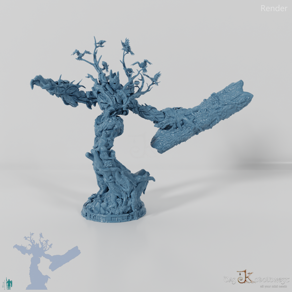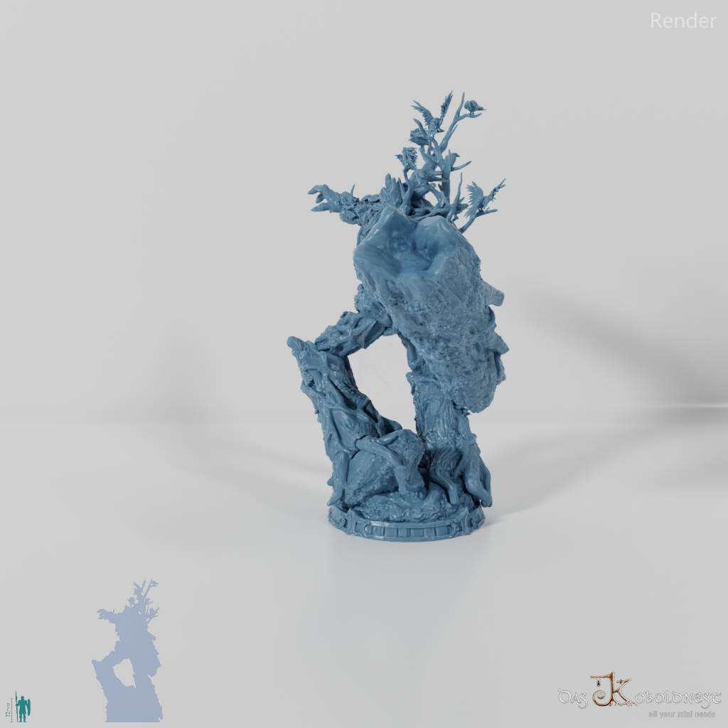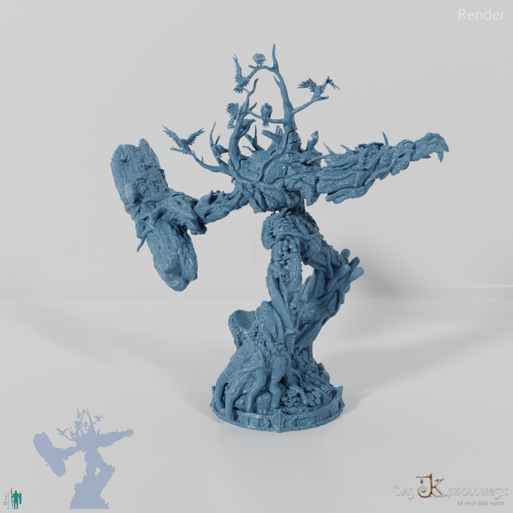 Eindrucksvoller Baumhirte, der mit einer kräftigen Pranke einen massiven Baumstamm ergriffen hat und dem ein Schwarm Krähen auf den Ästen sitzen