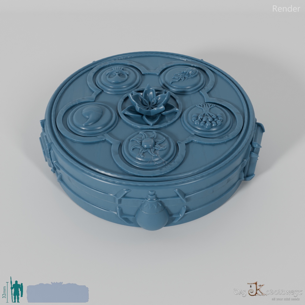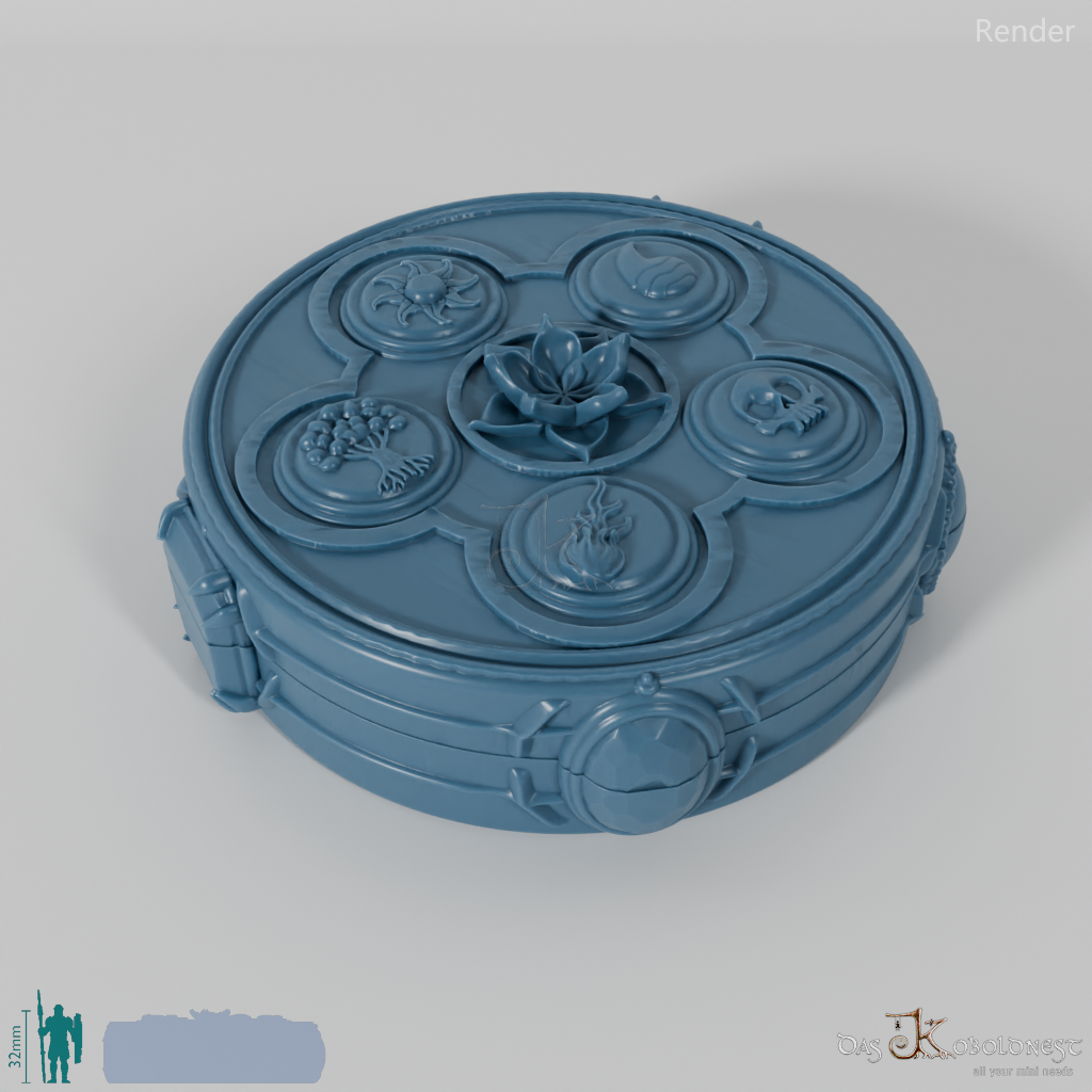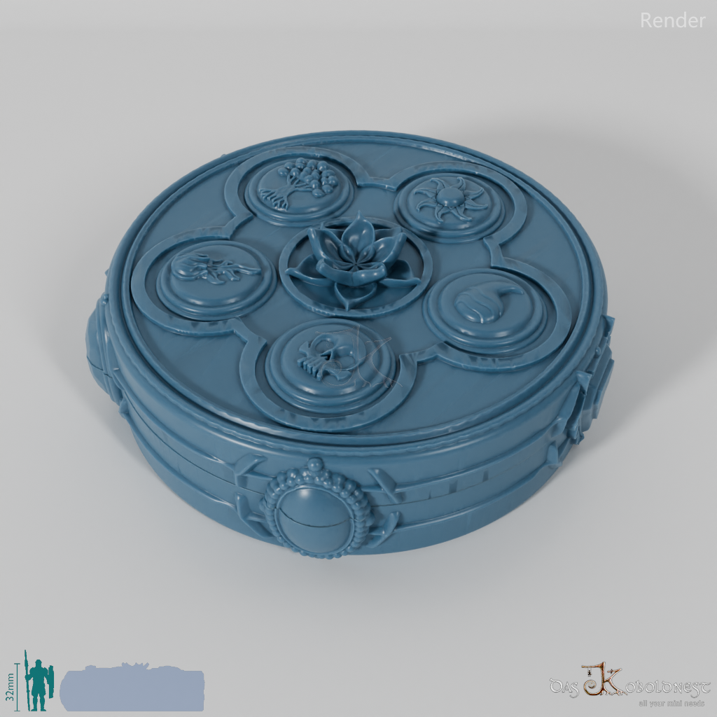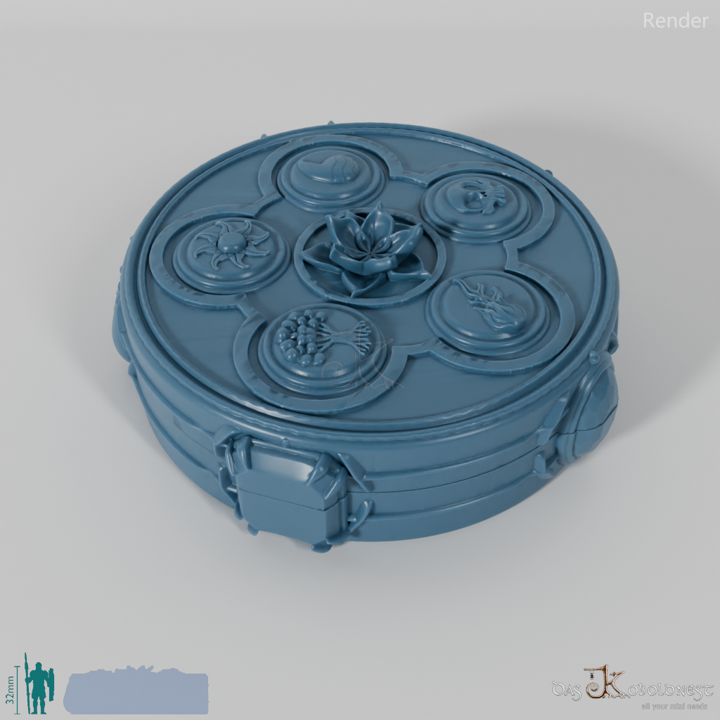 Verzierte Aufbewahrungsbox für sieben Würfel mit dem Relief von fünf Elementsymbolen um eine Blüte.