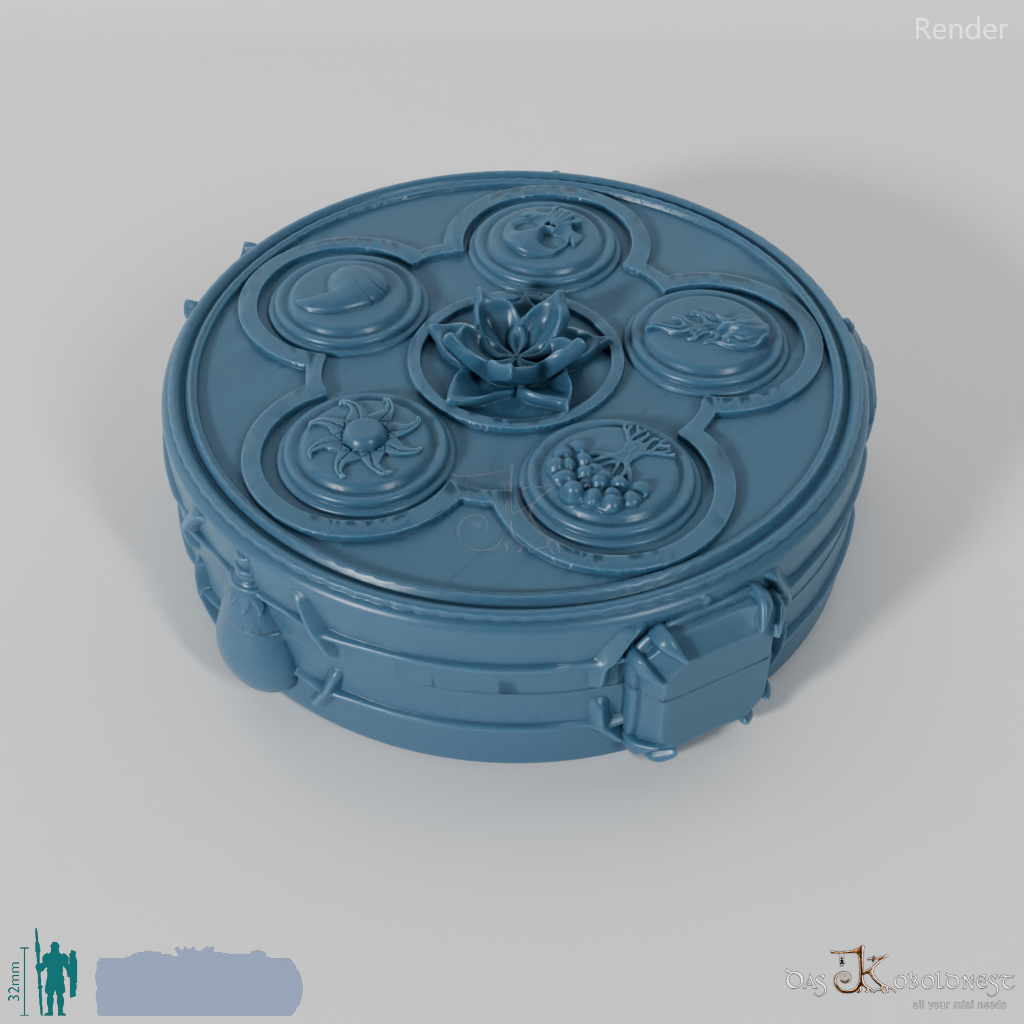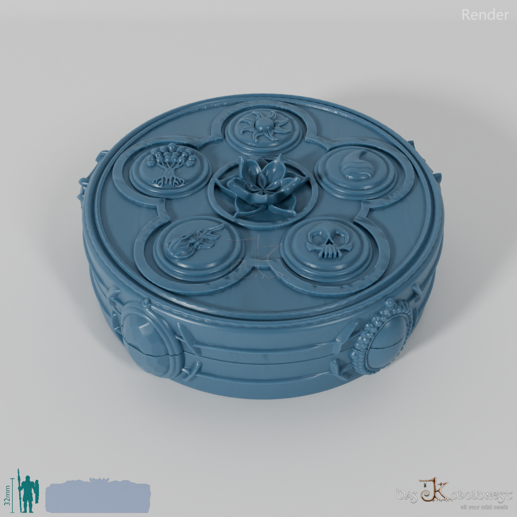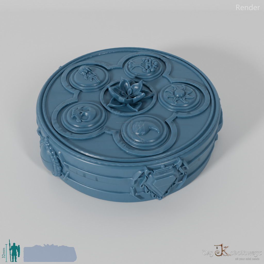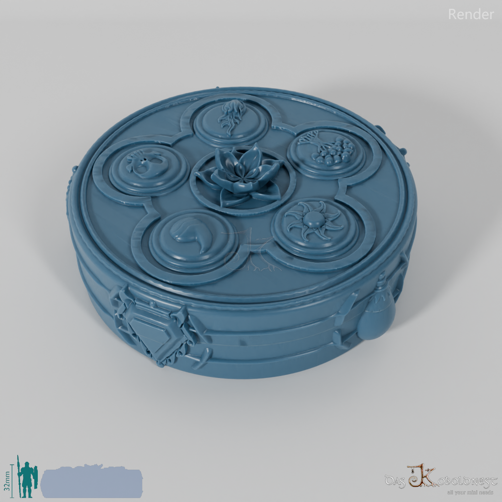 Verzierte Aufbewahrungsbox für sieben Würfel mit dem Relief von fünf Elementsymbolen um eine Blüte.