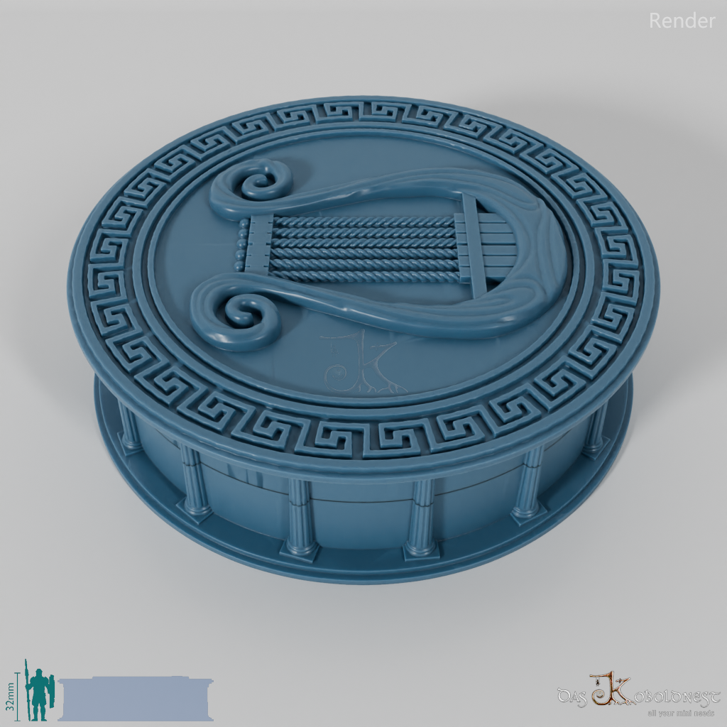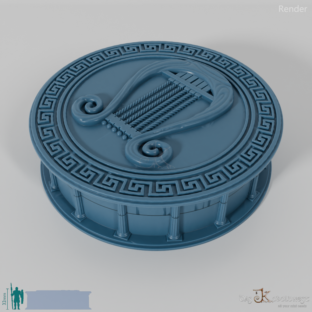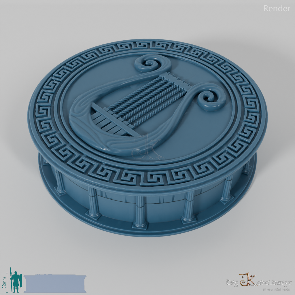 Verzierte Aufbewahrungsbox für sieben Würfel mit griechischen Ornamenten und dem Relief einer Lyra auf dem Deckel.