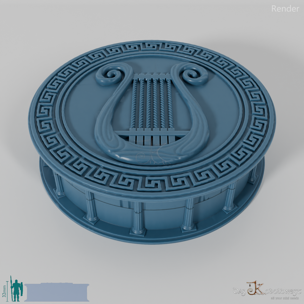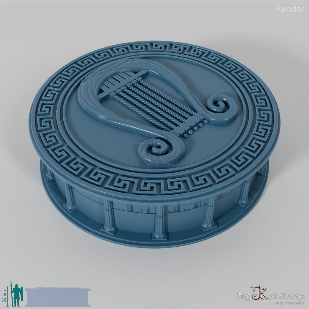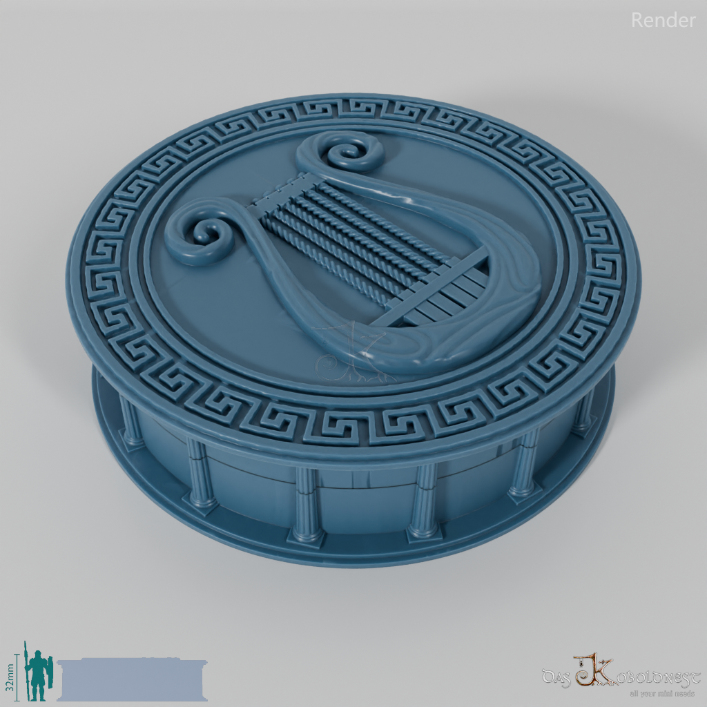 Verzierte Aufbewahrungsbox für sieben Würfel mit griechischen Ornamenten und dem Relief einer Lyra auf dem Deckel.