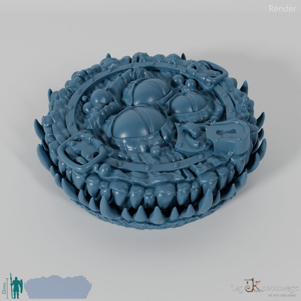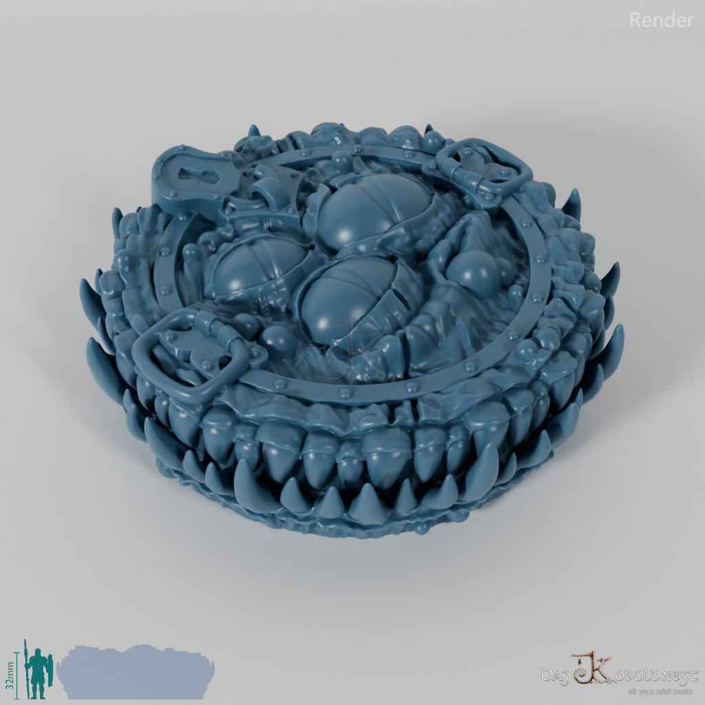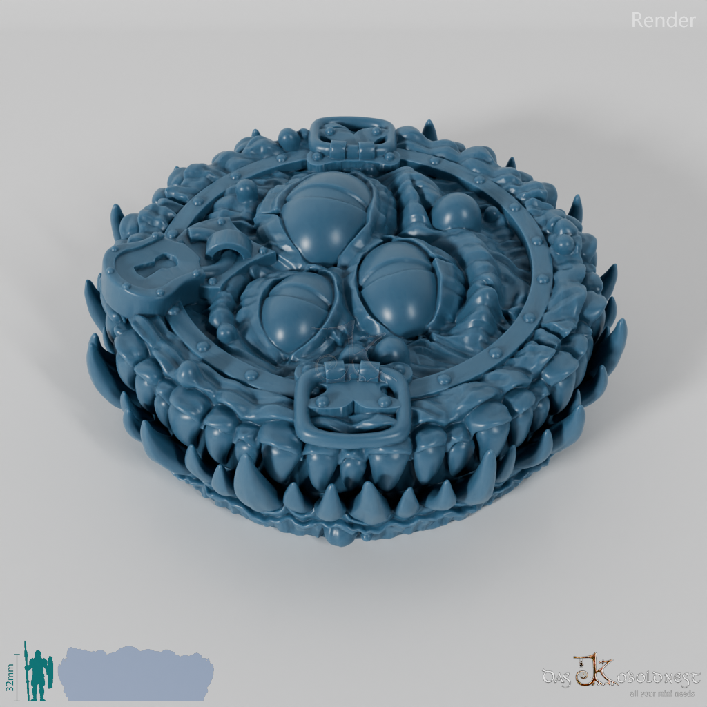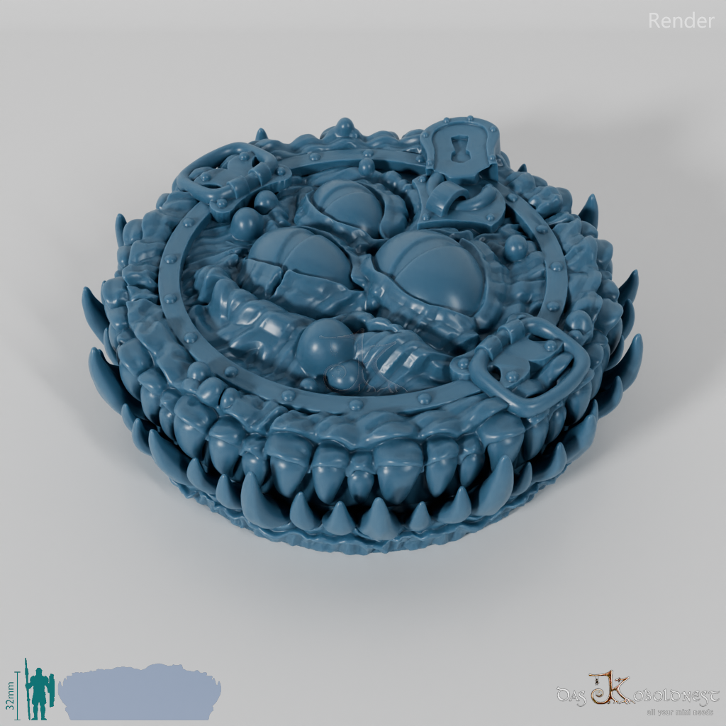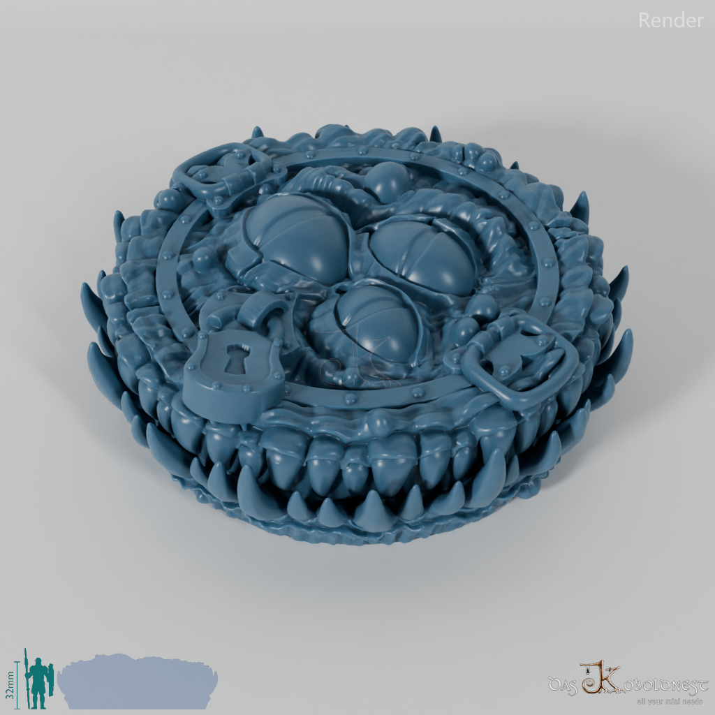 Verzierte Aufbewahrungsbox für sieben Würfel in Form eines Mimics mit scharfen Reißzähnen und drei Augen.