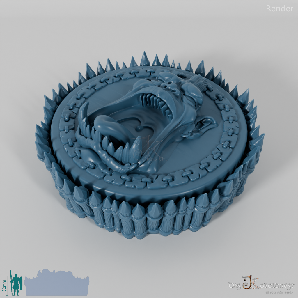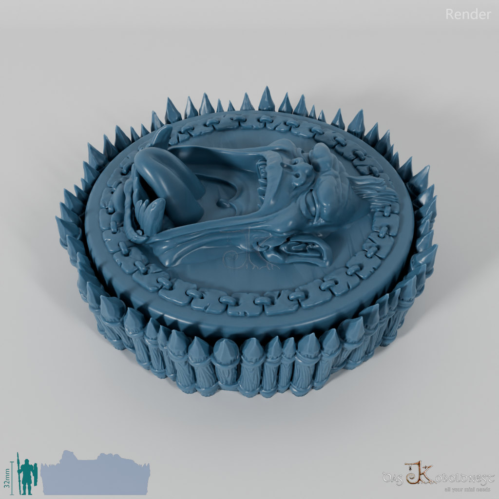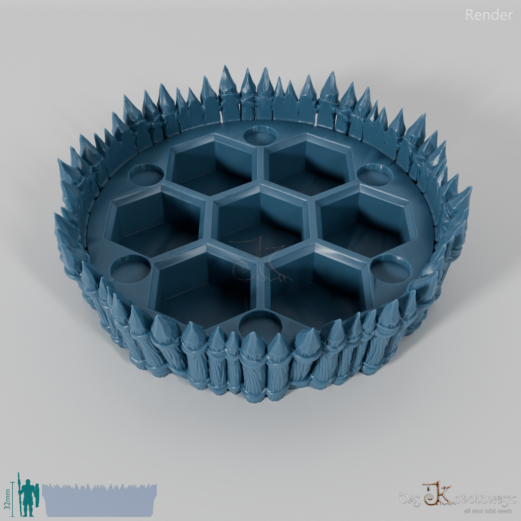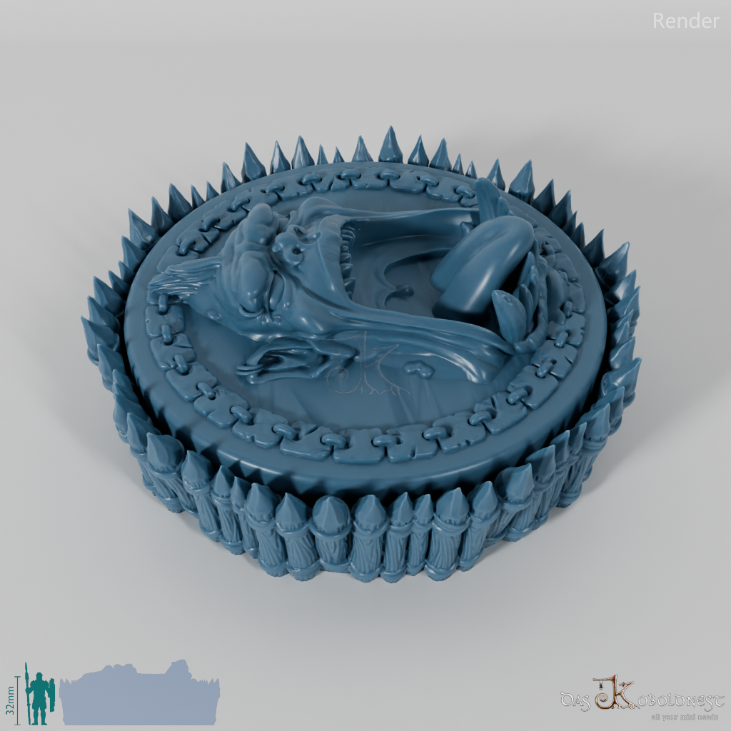 Verzierte Aufbewahrungsbox für sieben Würfel in Form einer kreisförmigen Holzpalisade und dem Relief eines Orkkopfes auf dem Deckel.