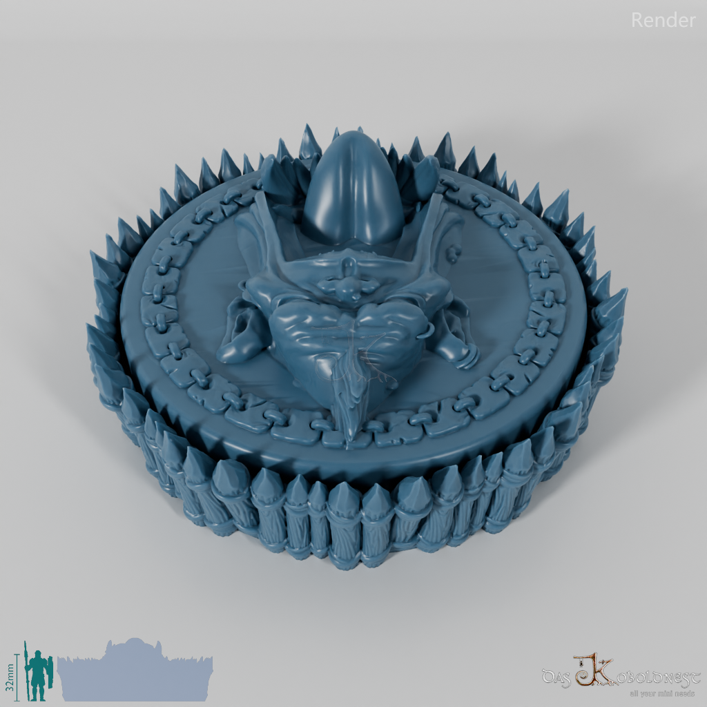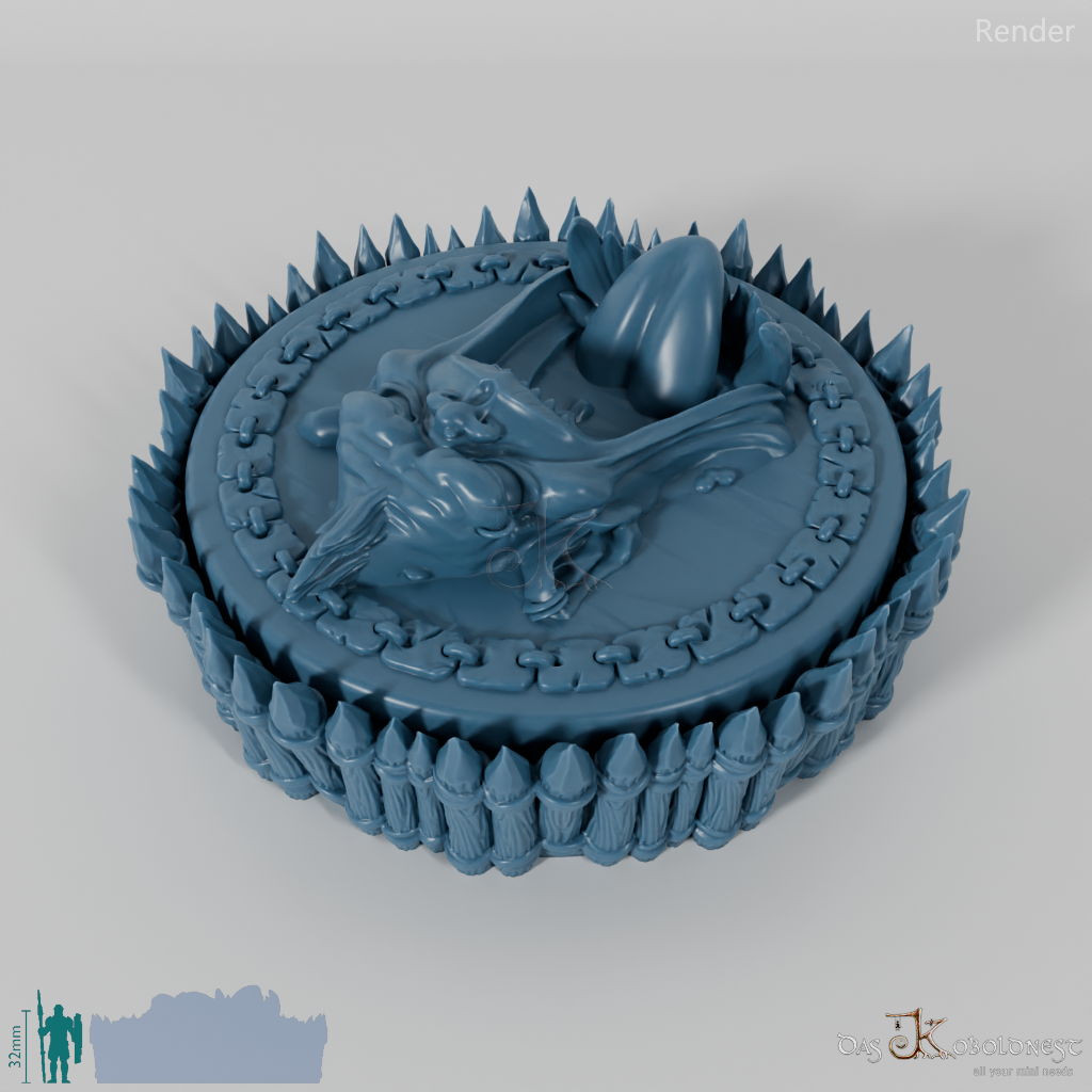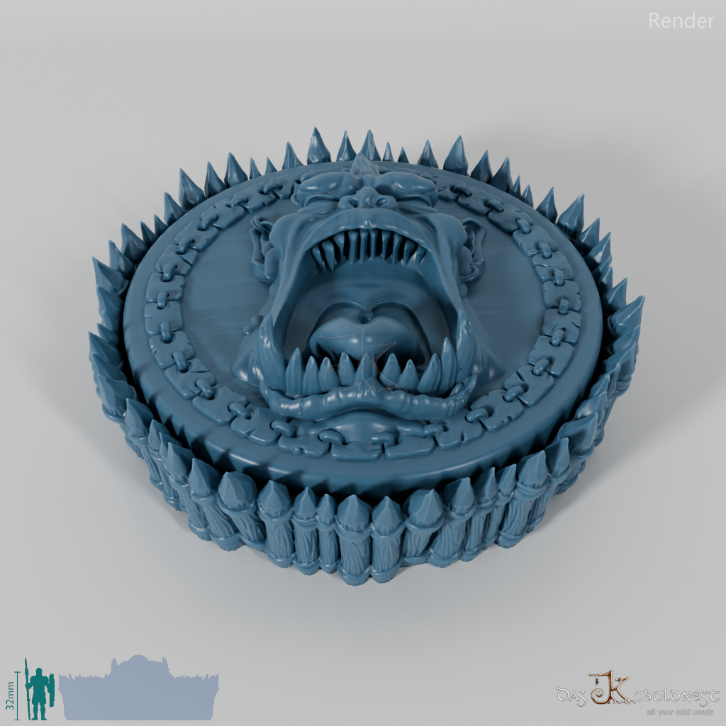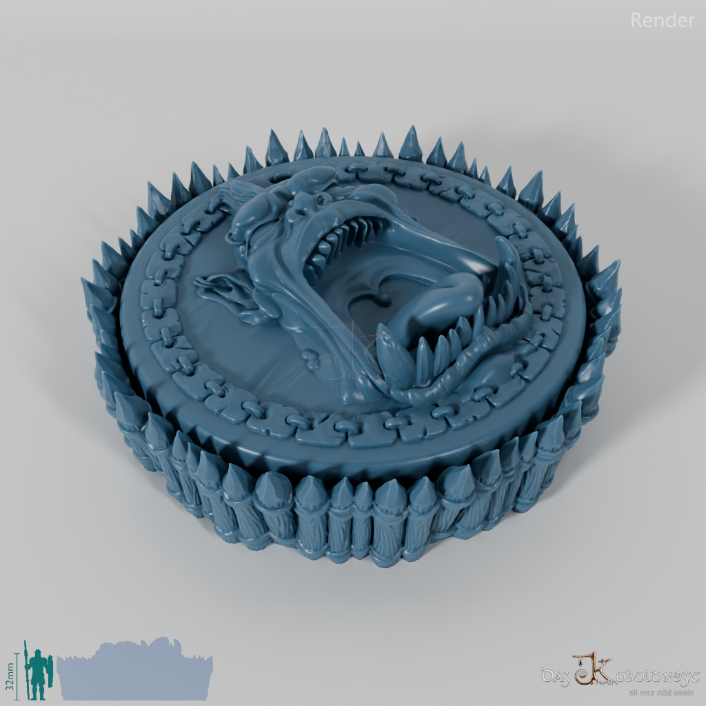Verzierte Aufbewahrungsbox für sieben Würfel in Form einer kreisförmigen Holzpalisade und dem Relief eines Orkkopfes auf dem Deckel.