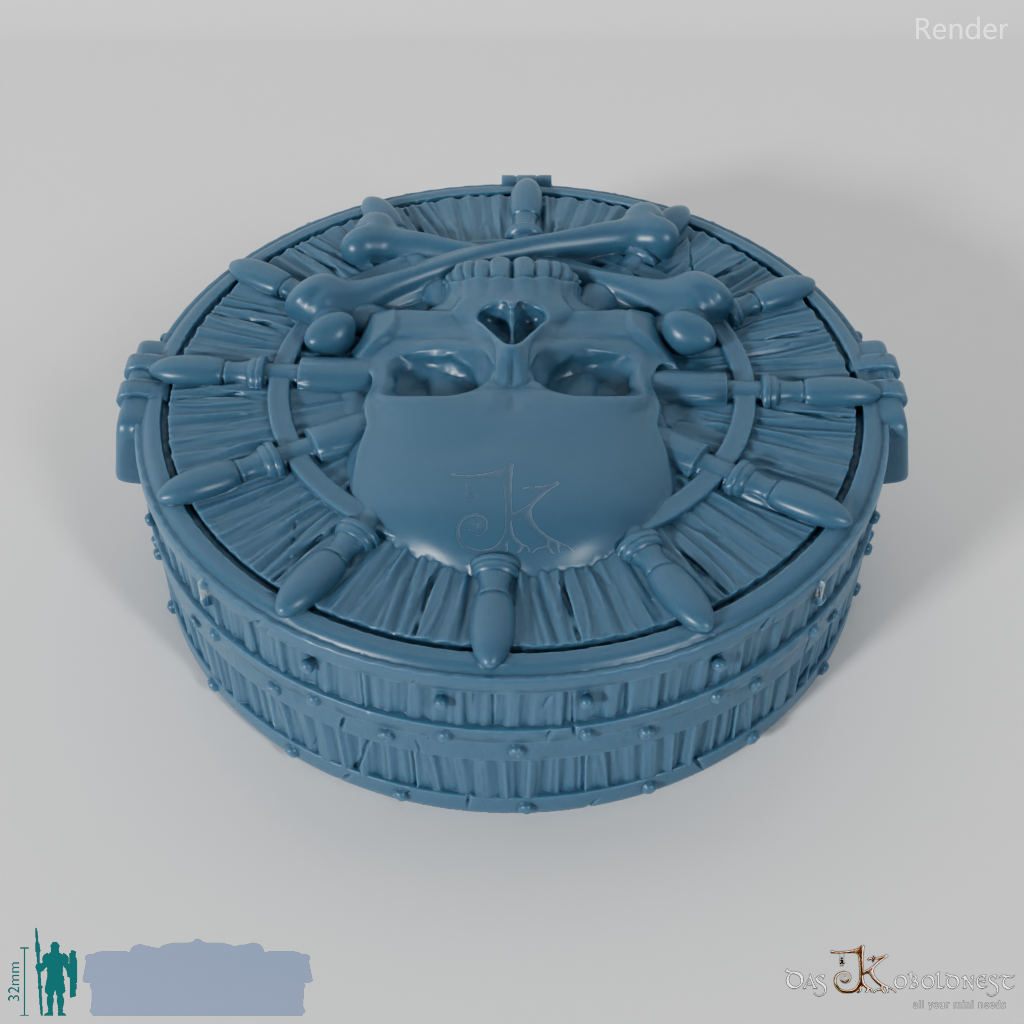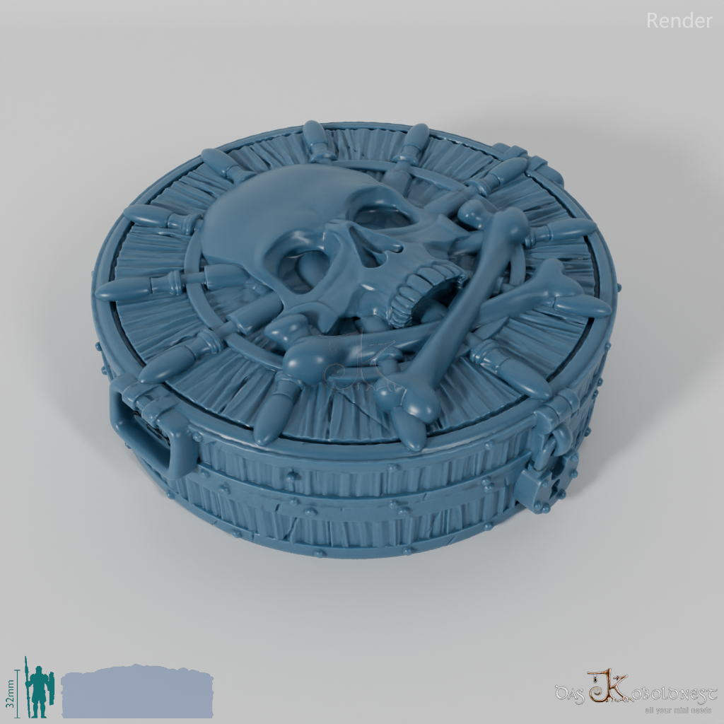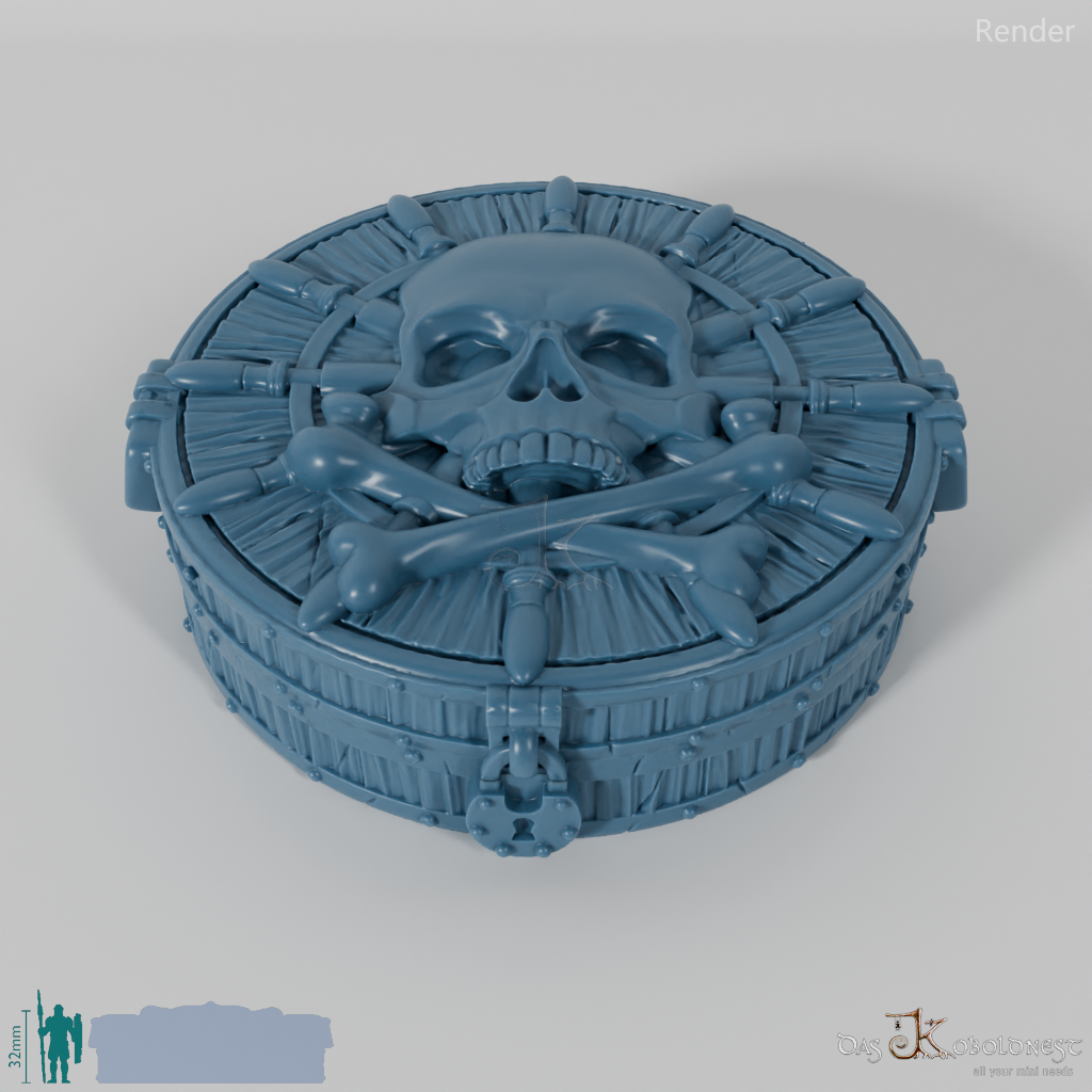 Verzierte Aufbewahrungsbox für sieben Würfel mit dem Relief eines Piratenschädels auf dem Deckel.