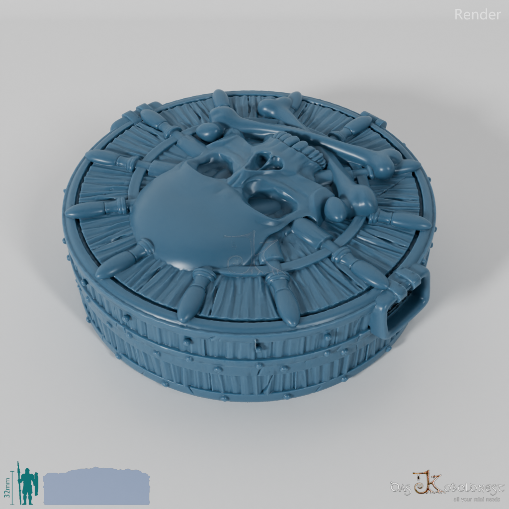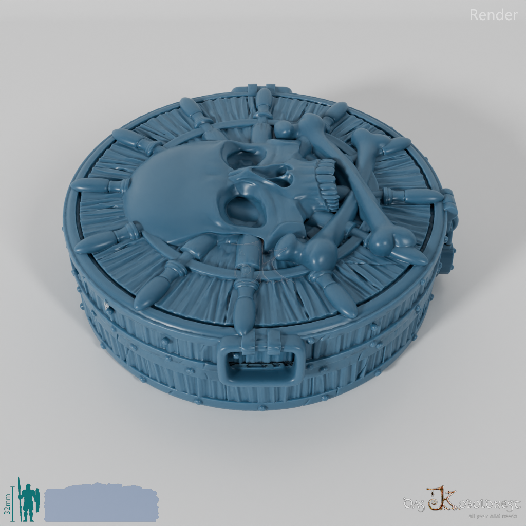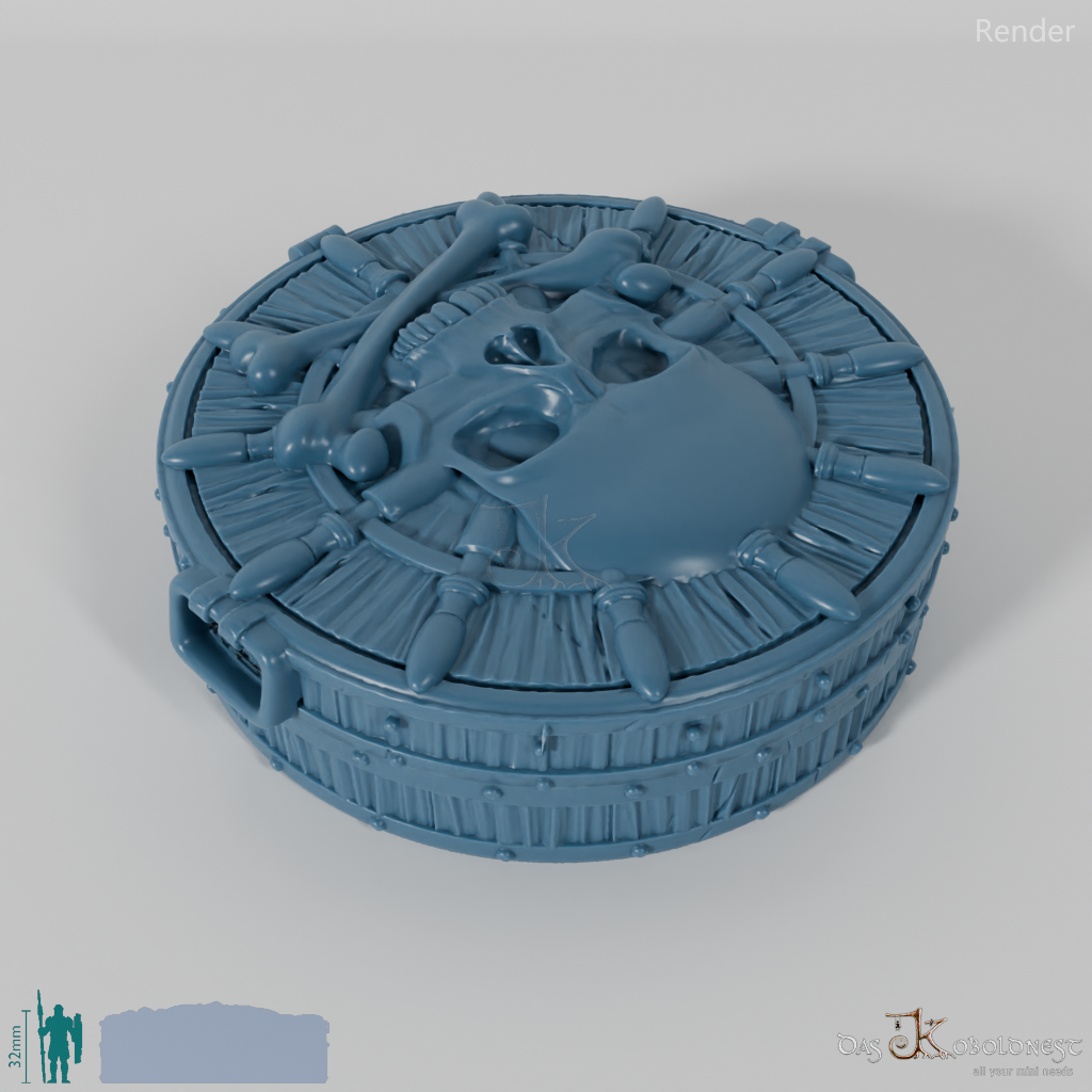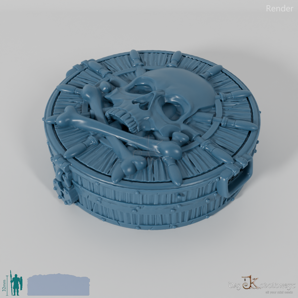 Verzierte Aufbewahrungsbox für sieben Würfel mit dem Relief eines Piratenschädels auf dem Deckel.
