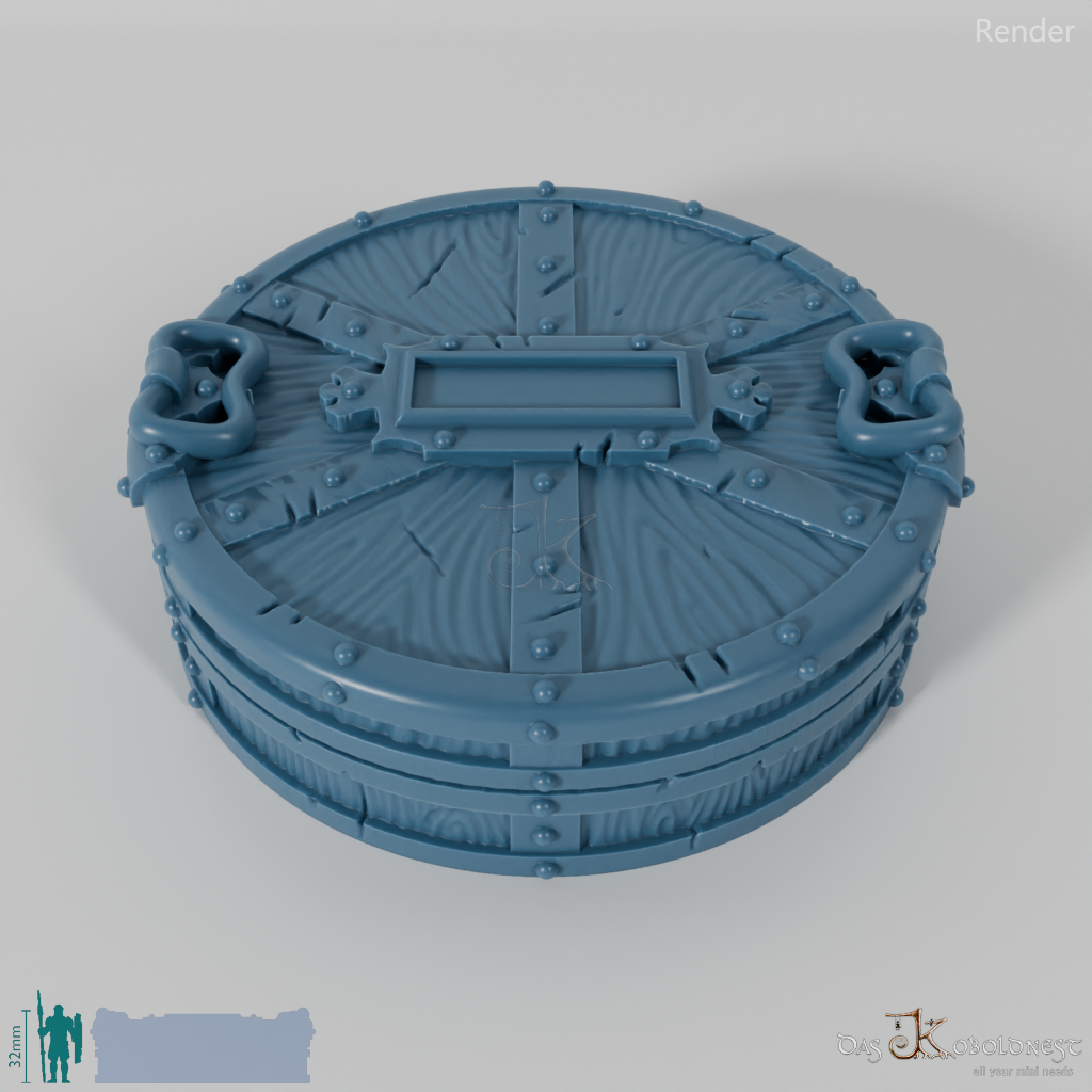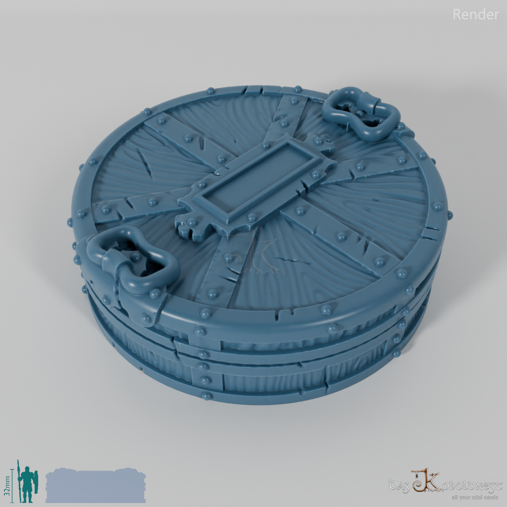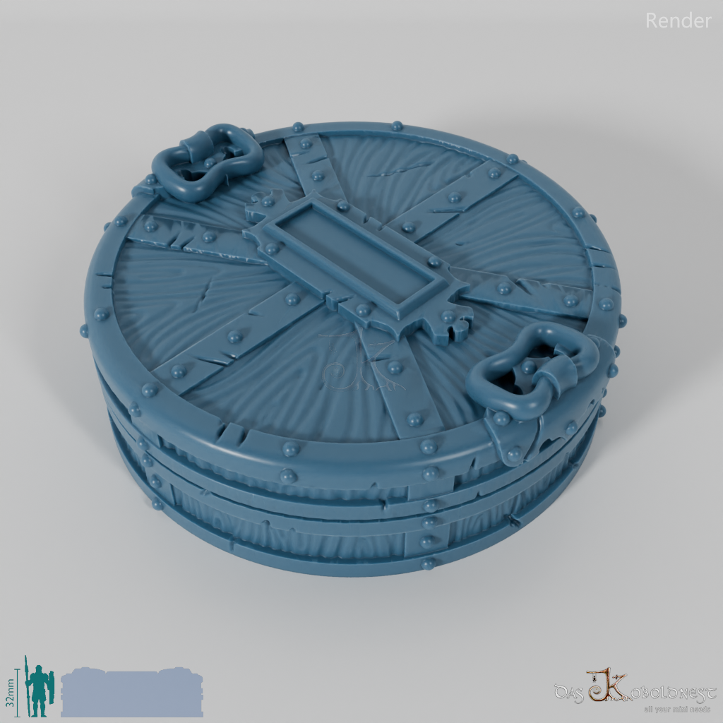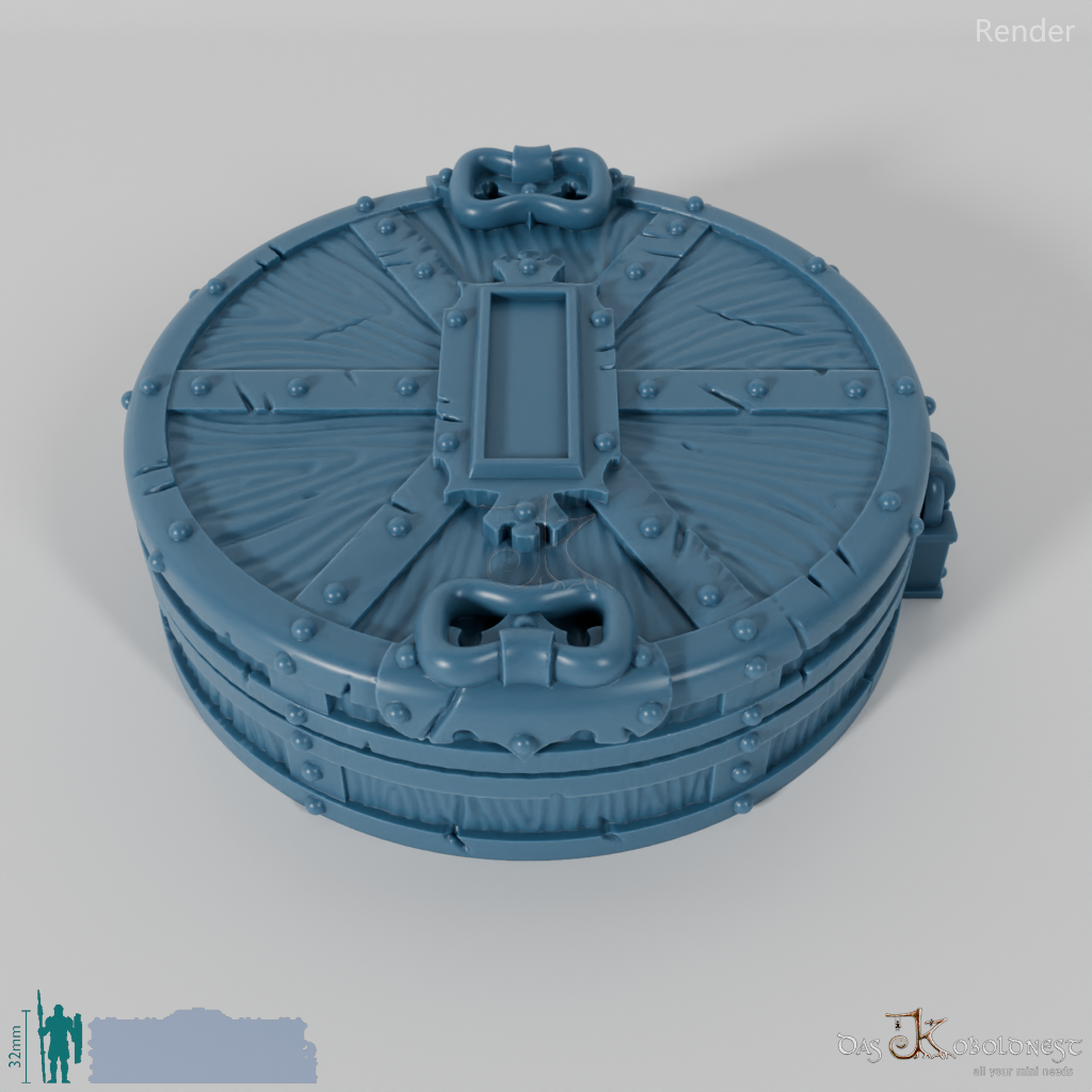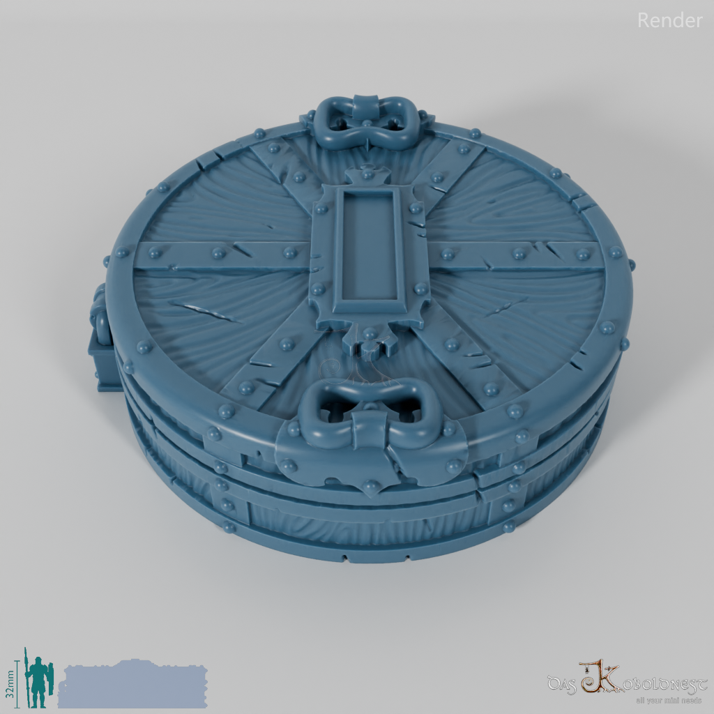 Verzierte Aufbewahrungsbox für sieben Würfel in Form einer Schatztruhe.