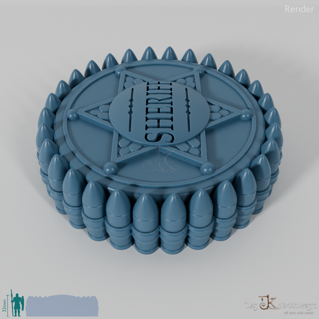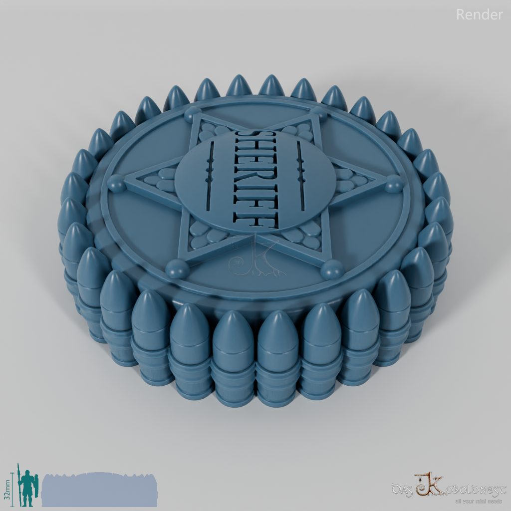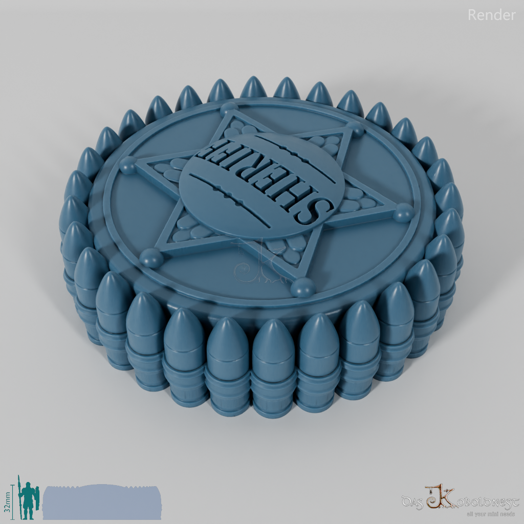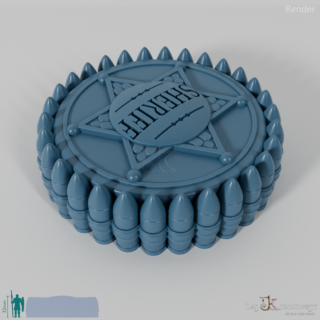 Verzierte Aufbewahrungsbox für sieben Würfel mit dem Relief eines Sheriffsterns auf dem Deckel.