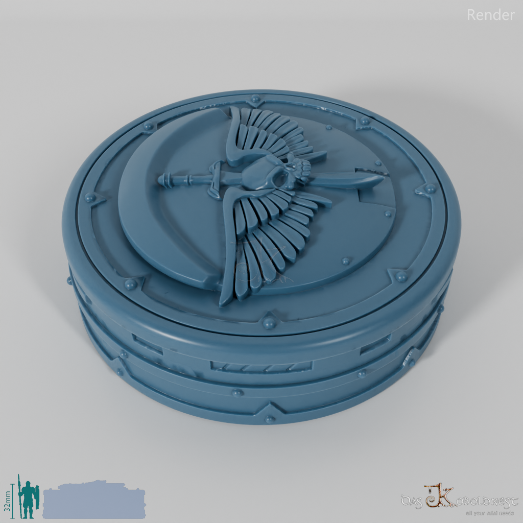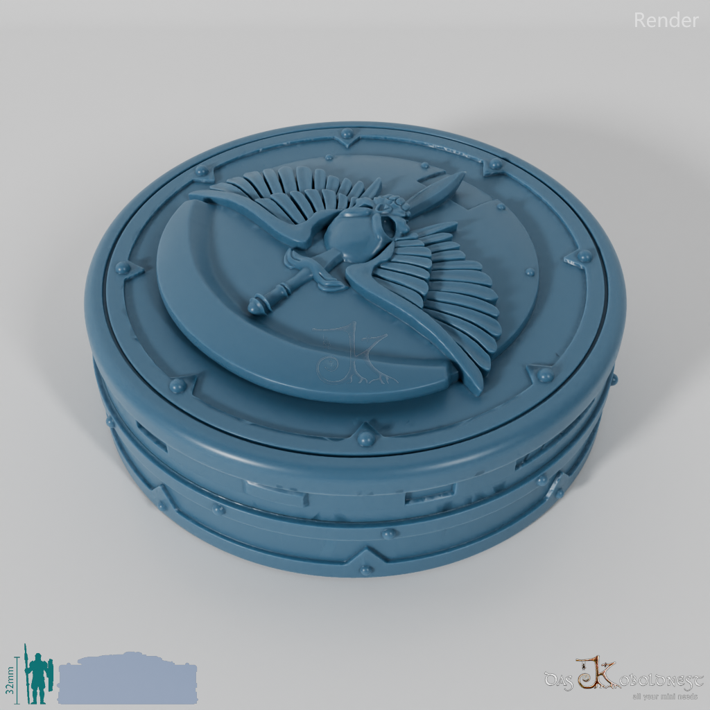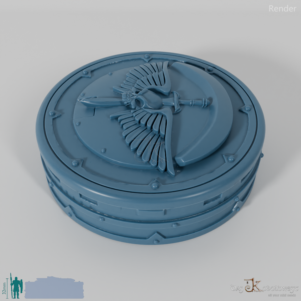 Verzierte Aufbewahrungsbox für sieben Würfel in SciFi-Optik mit dem Relief eines geflügelten Totenschädels mit Schwert auf dem Deckel.