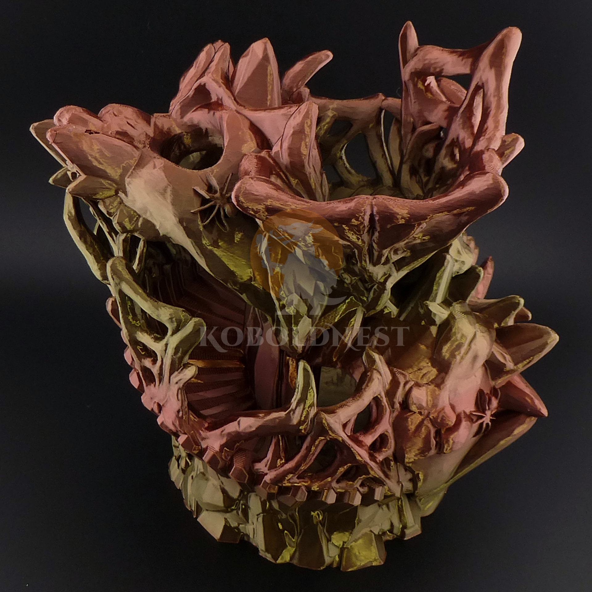 Fantastischer Würfelturm in Form mehrerer Totenschädel und dicker Spinnenweben mit Wendeltreppe. Die Würfel können in das obere Spinnennetz oder die Augen des oberen Schädels geworfen werden und rollen über die offene Wendeltreppe schwungvoll in die untere Auffangschale.