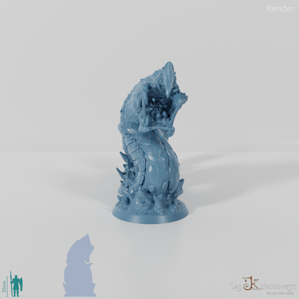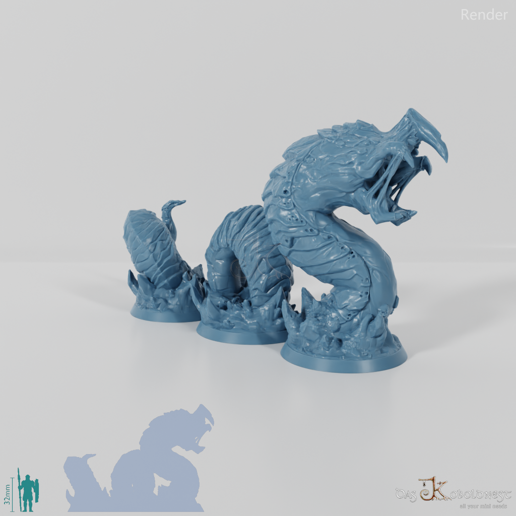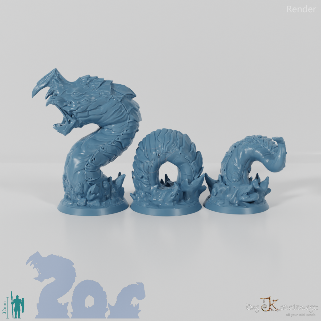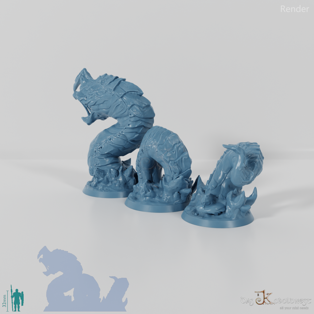 Gewaltiger Wurm mit aufgerissenem Schlund, der sich in drei Abschnitten durch den Erdboden wühlt.