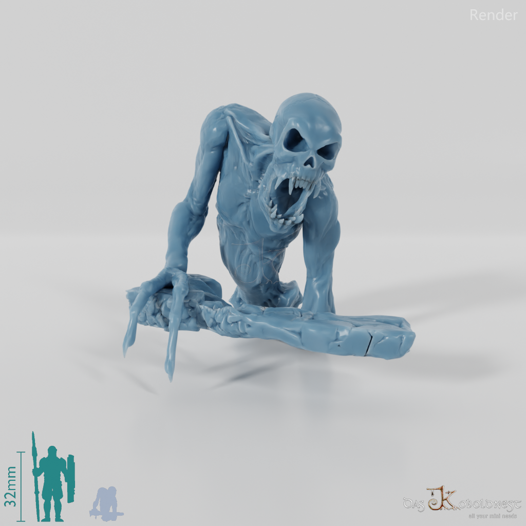 Entstellte untote Gestalt ohne Beine und mit langen Krallen und Reißzähnen.