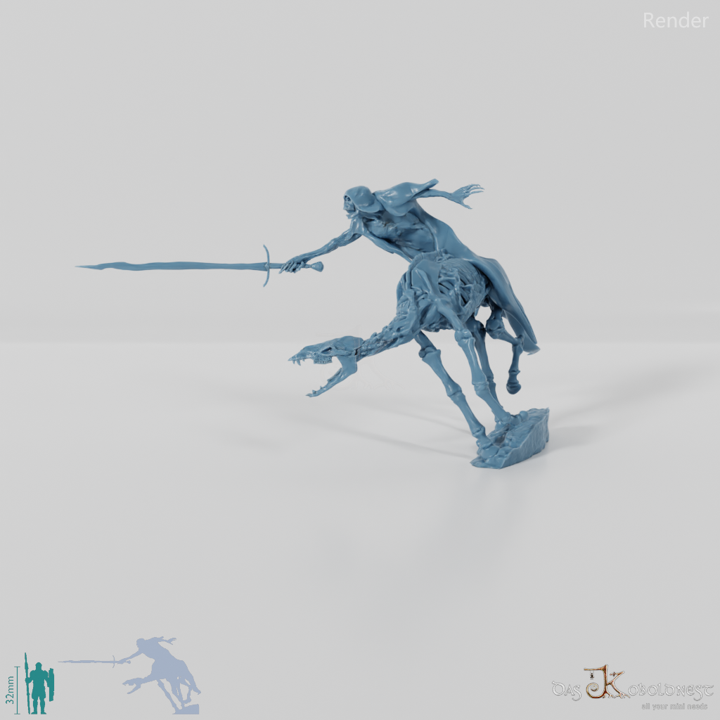 Skelett mit weiter Kutte und langem Schwert, das auf einem skelettierten Pferd mit Kette um den Hals reitet.