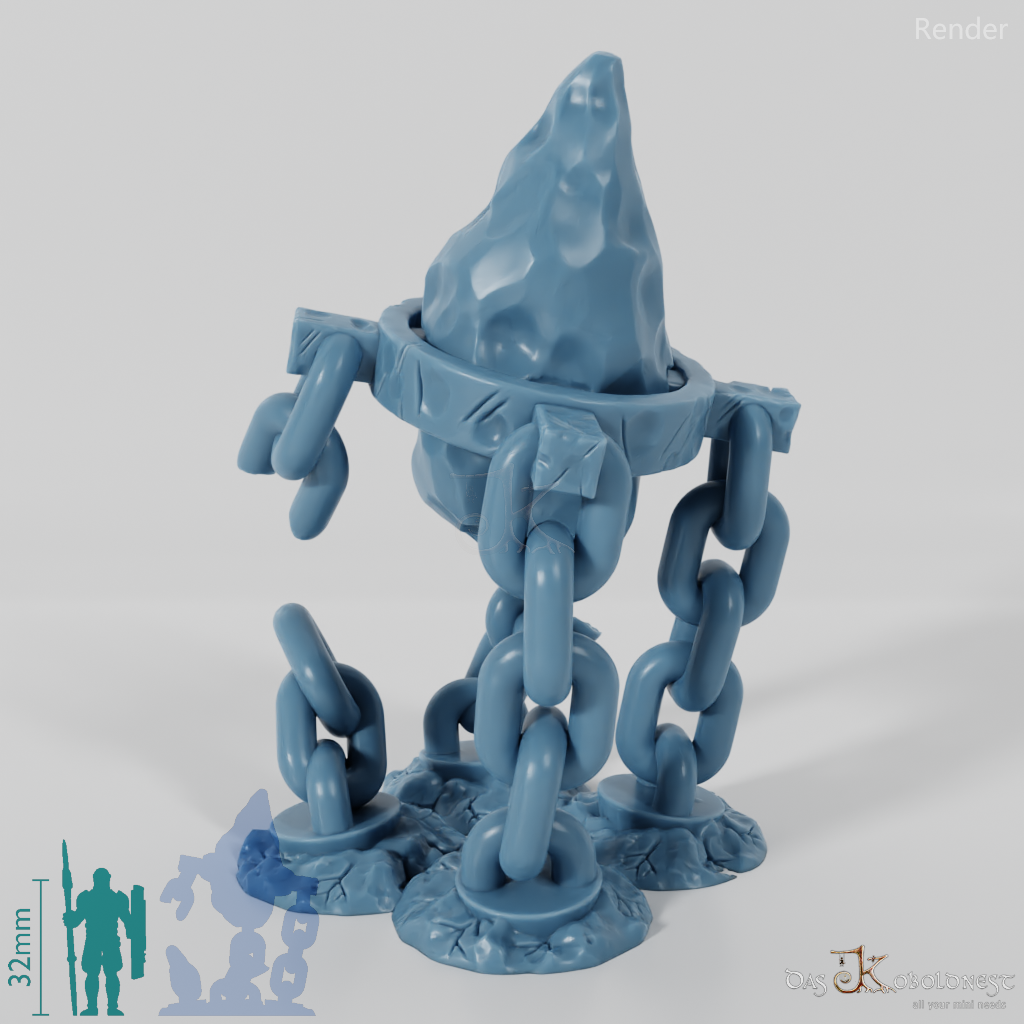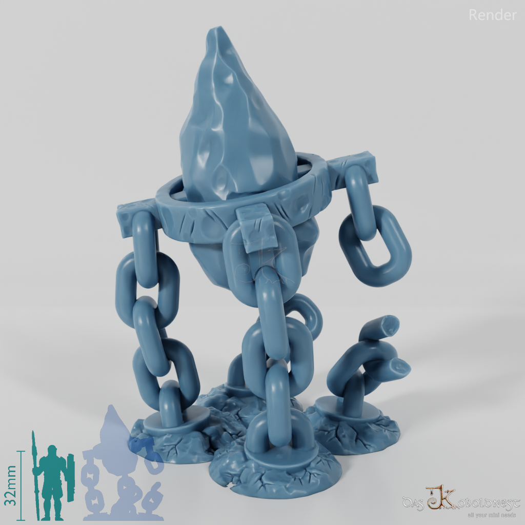 Drei verschiedene, grob behauene schwebende Steine, die durch eine Metallmanschette mit Ketten am Boden verankert sind. Artikel besteht aus Dark Stone Shard 01, 02 und 03