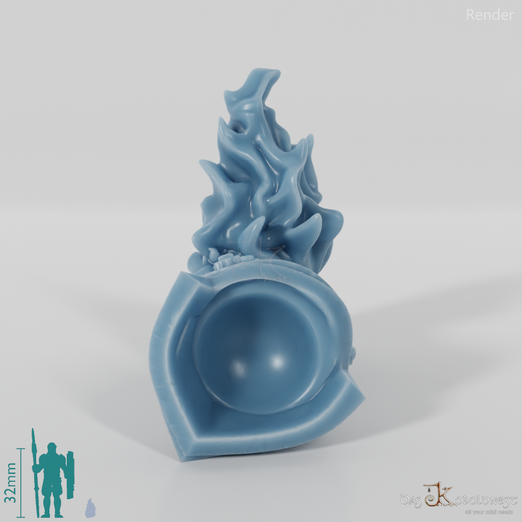 Kleiner Zauber in Form einer Flamme, der ruhig auf einer Hand in Plattenrüstung wabert