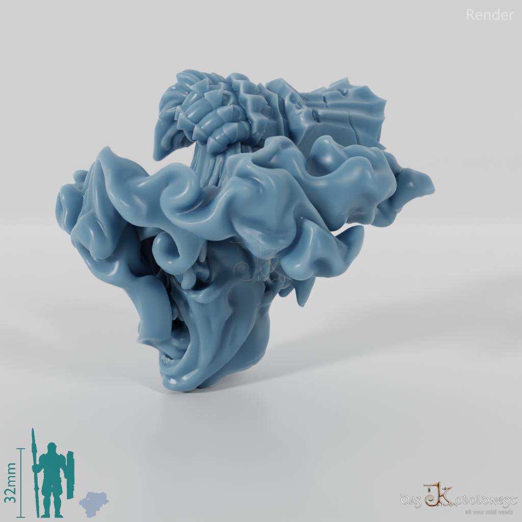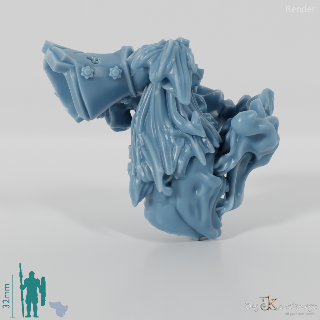 Zauber in Form einer Rauchwolke, der von einem von einer Hand in Plattenrüstung gehaltenen abgetrennten Kopf ausgeht