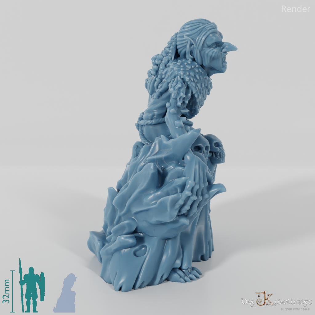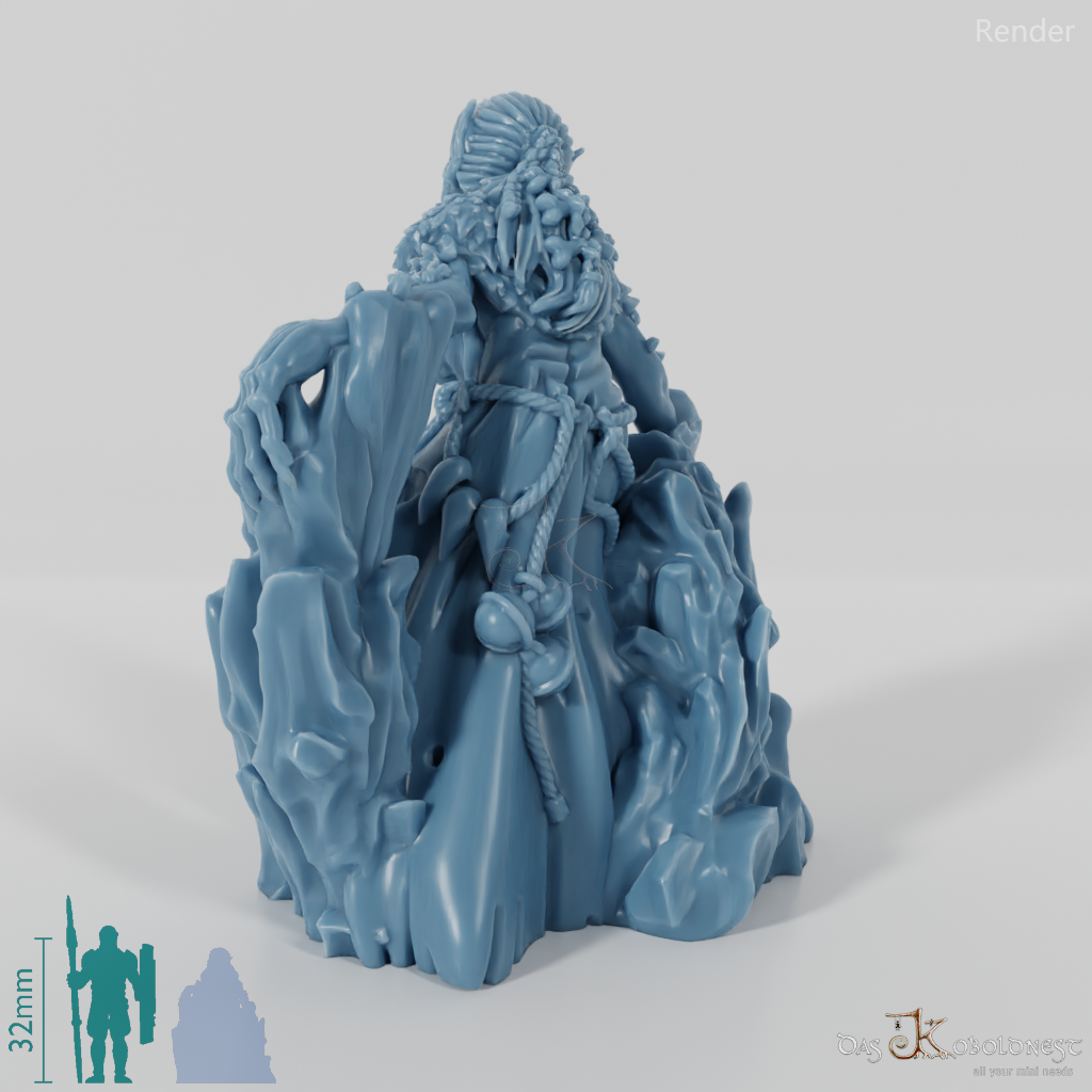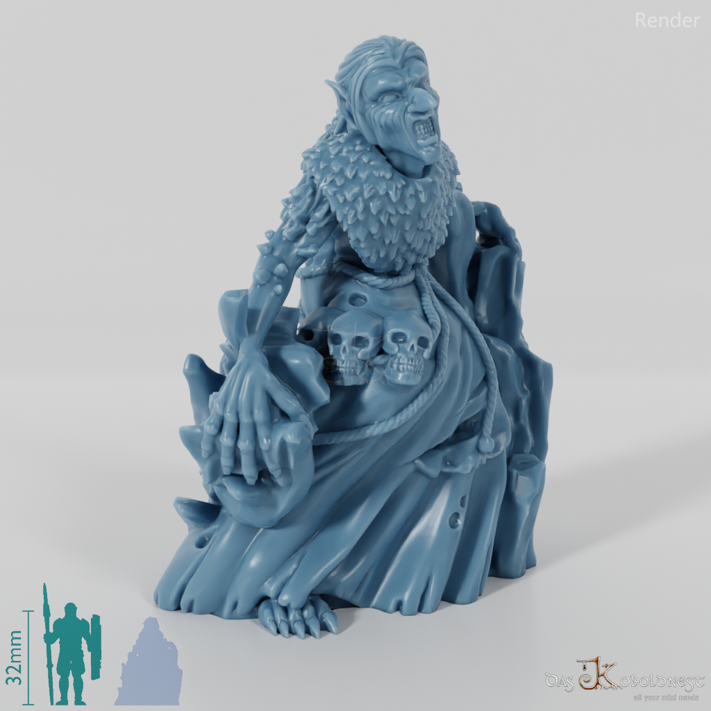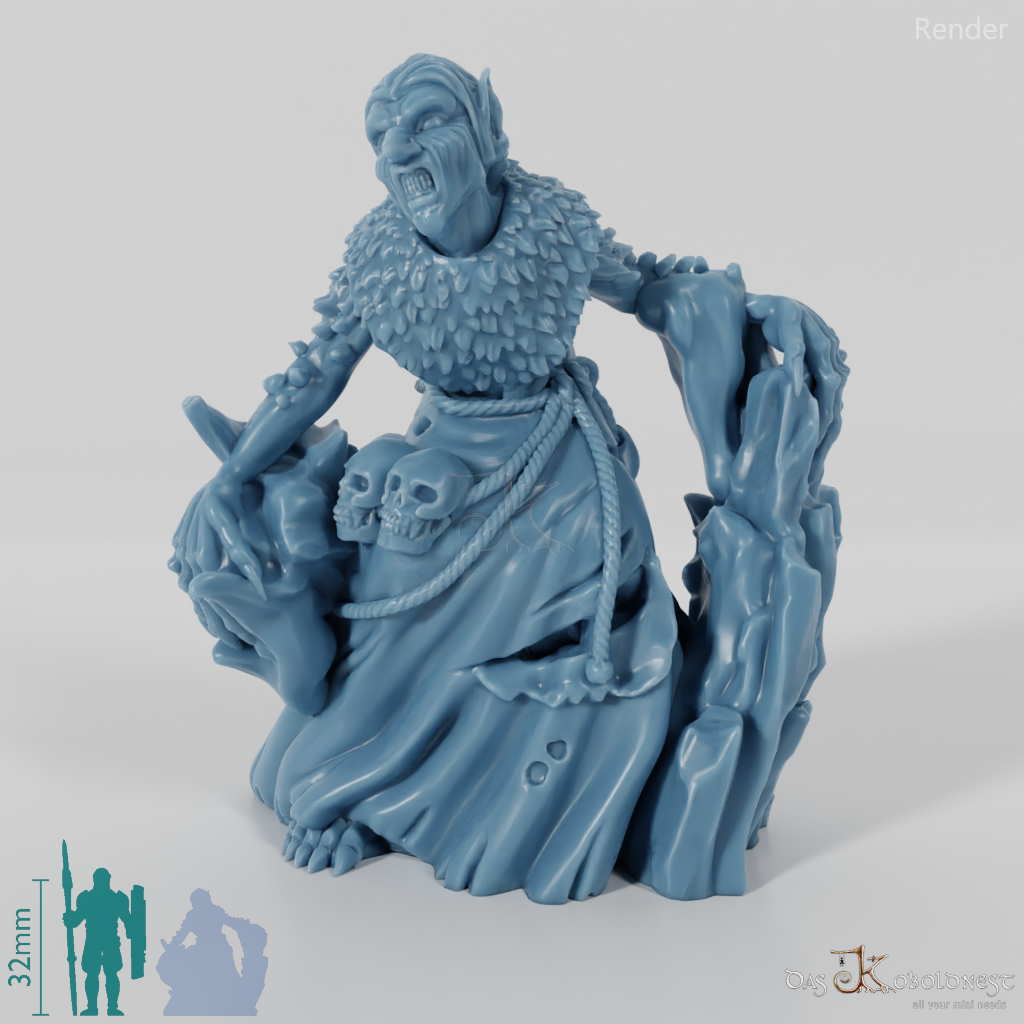 Alte Vettel mit faltigem Gesicht und spitzen Ohren, die sich auf eine Eissäule lehnt und Menschenschädel am Gürtel trägt