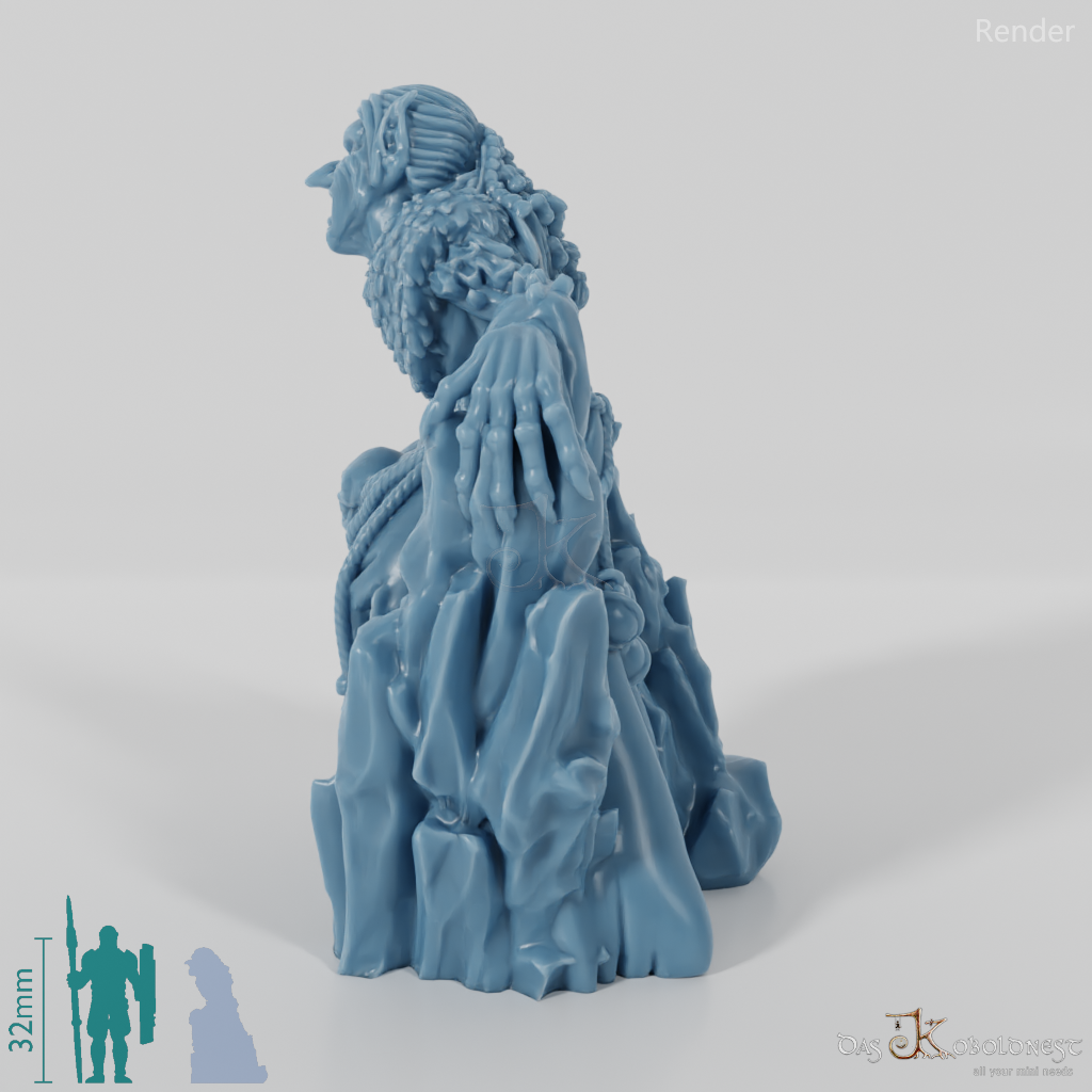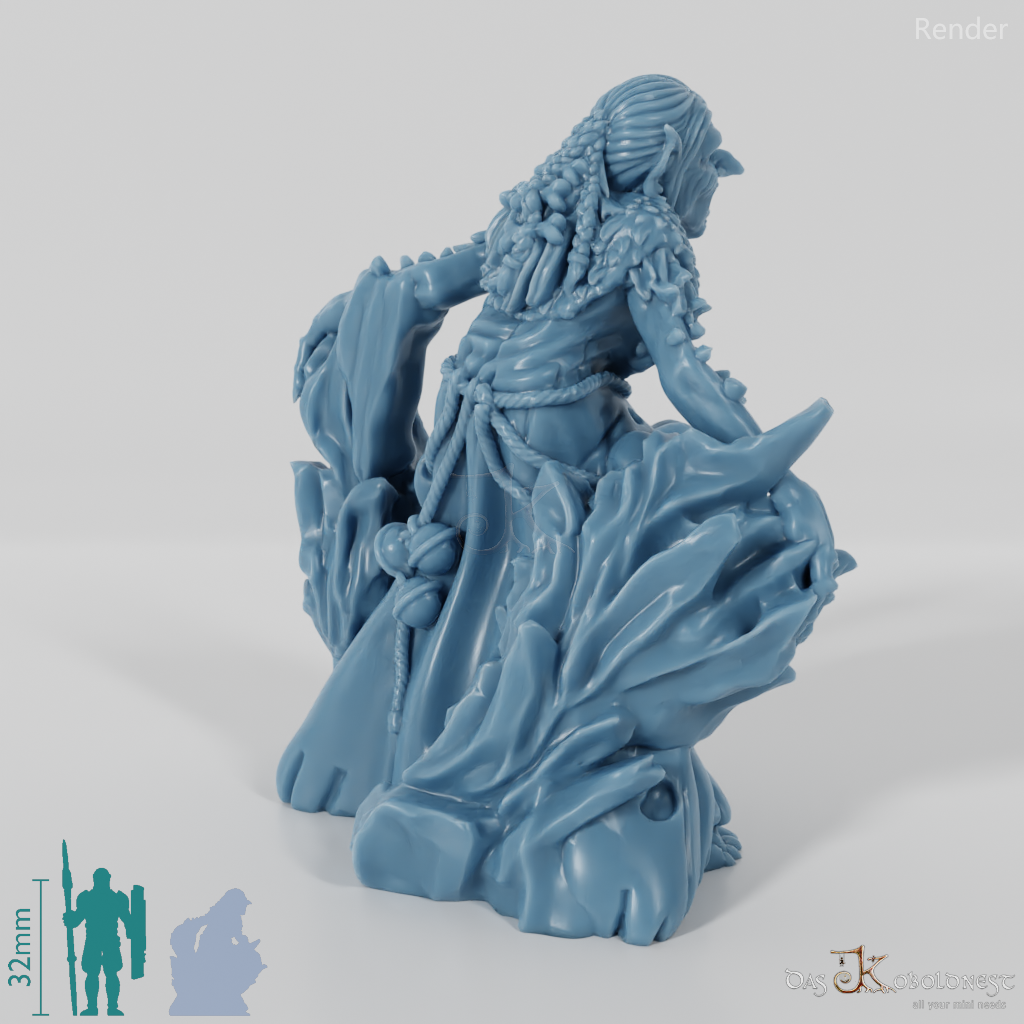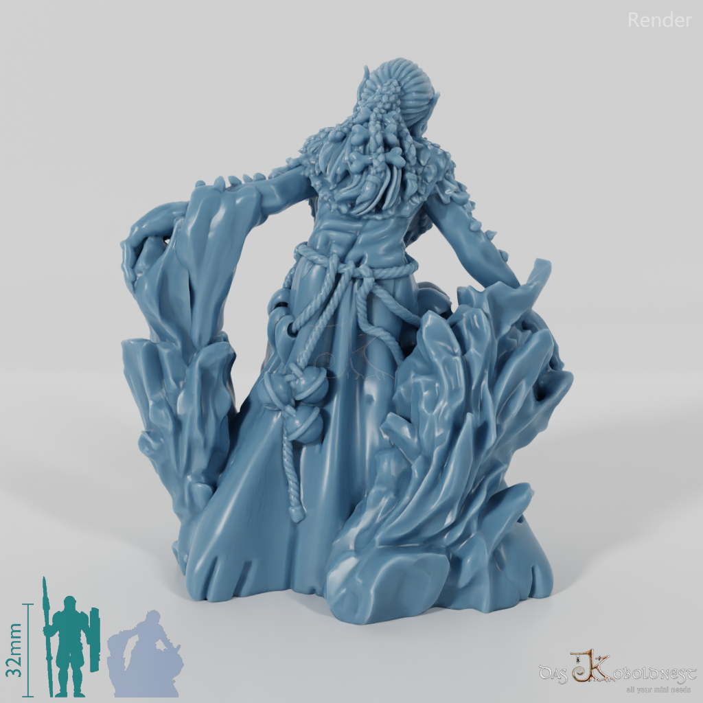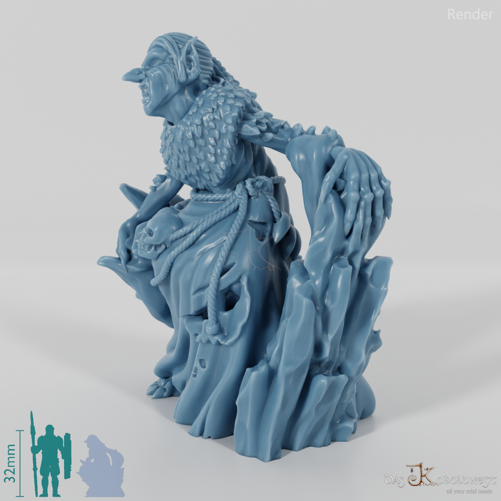 Alte Vettel mit faltigem Gesicht und spitzen Ohren, die sich auf eine Eissäule lehnt und Menschenschädel am Gürtel trägt