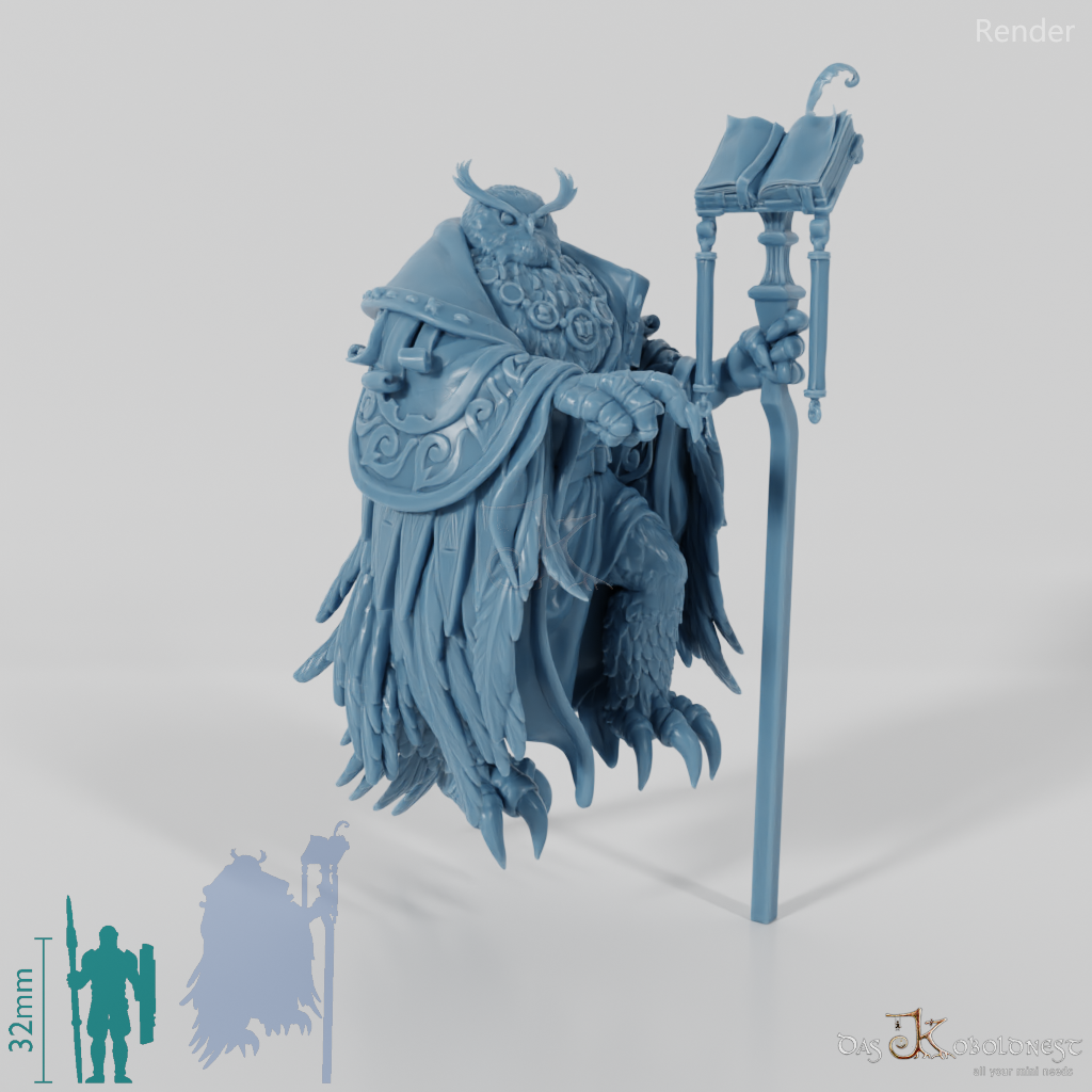 Streng blickende Eulengestalt, die in eine prunkvolle Robe gehüllt ist und einen langen Stab mit aufgeschlagenem Buch trägt. Modell wahlweise mit umfangreich gestalteter 50 mm Base voller Bücherstapel, Schriftrollen und einer schwebenden Schriftrolle verfügbar