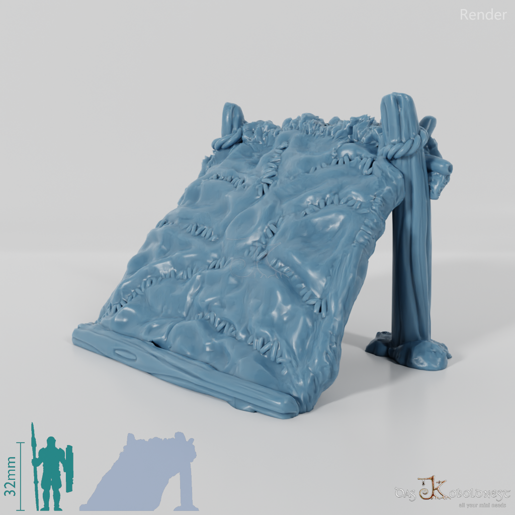 Schräge, mit Leder und Fellen verhangene Holzkonstruktion, die als Wetterschutz und Lagerplatz dienen kann.