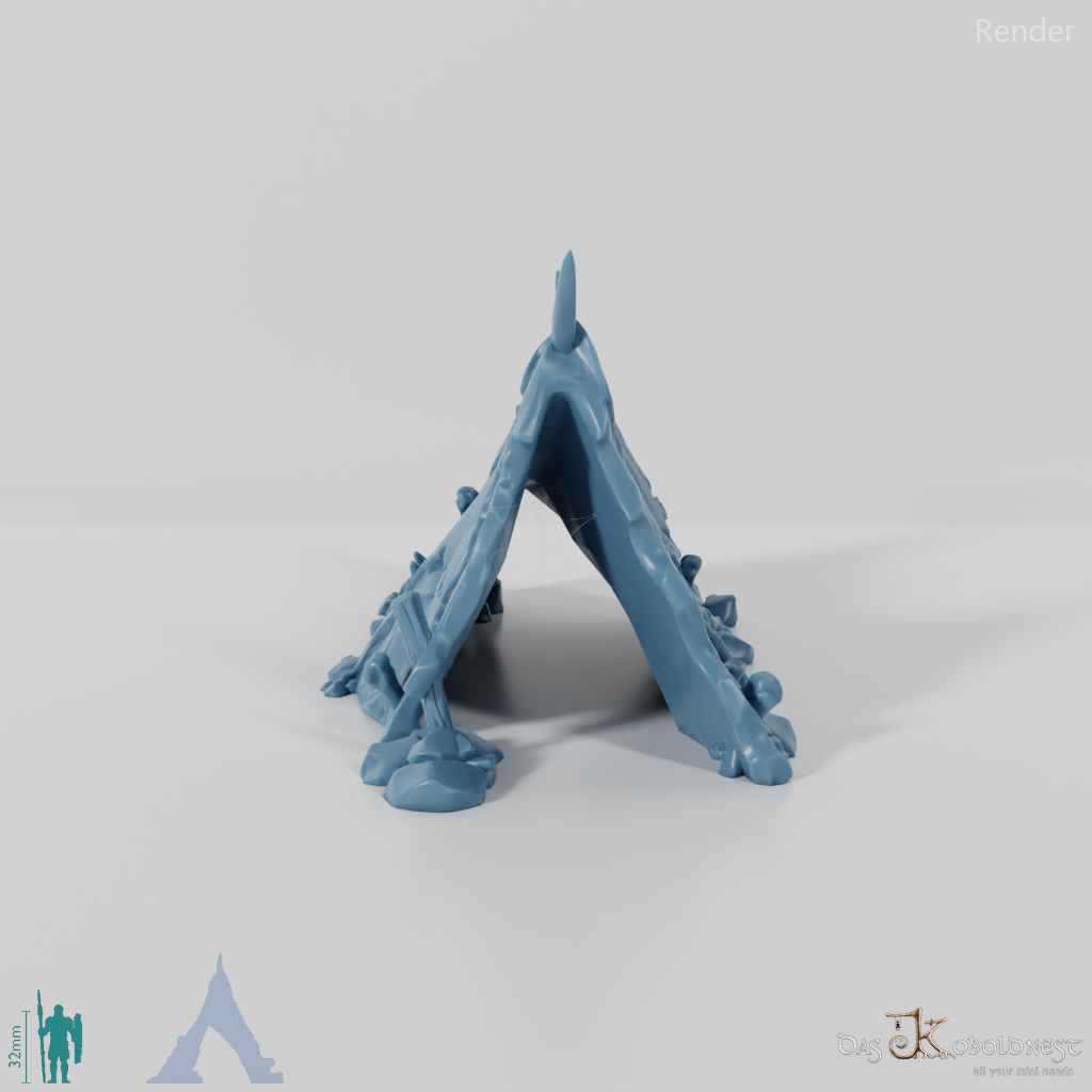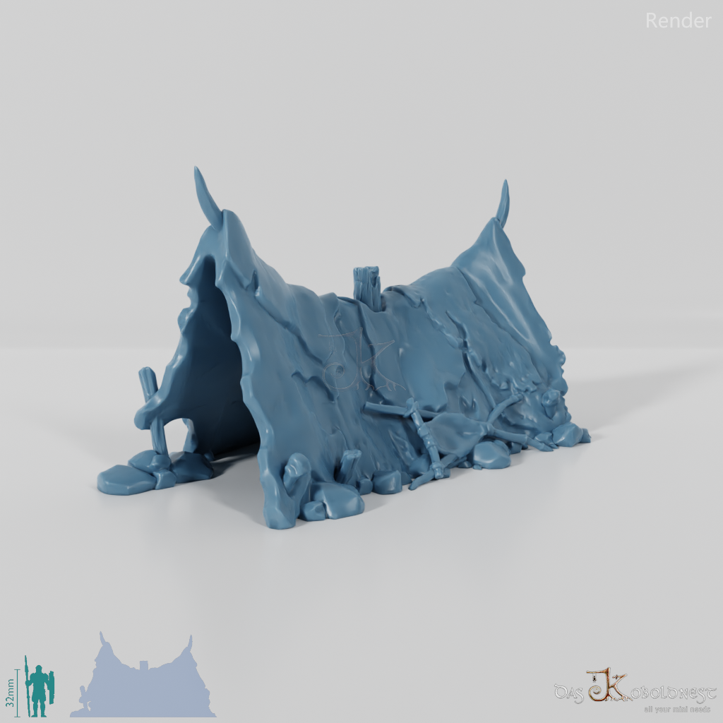 Zelt aus übereinanderliegenden Häuten, auf dem sich Menschenschädel befinden