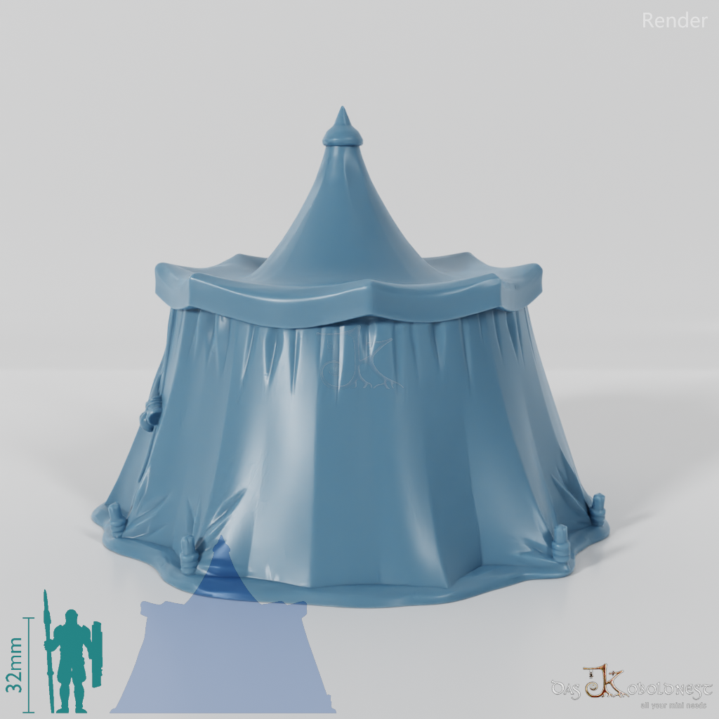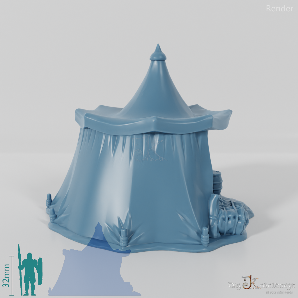 Elegantes, rundes Zelt mit Mittelstange und in die Erde geschlagenen Holzpflöcken zur Befestigung. An der Zeltseite hängt ein Signalhorn, neben dem Eingang befinden sich ein Paket und ein Fass.