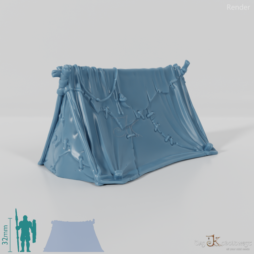 Geschlossenes, einfaches Zelt, das aus ungleichmäßigen Lederstücken genäht ist