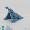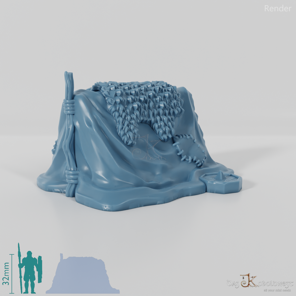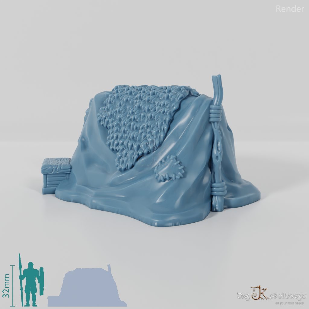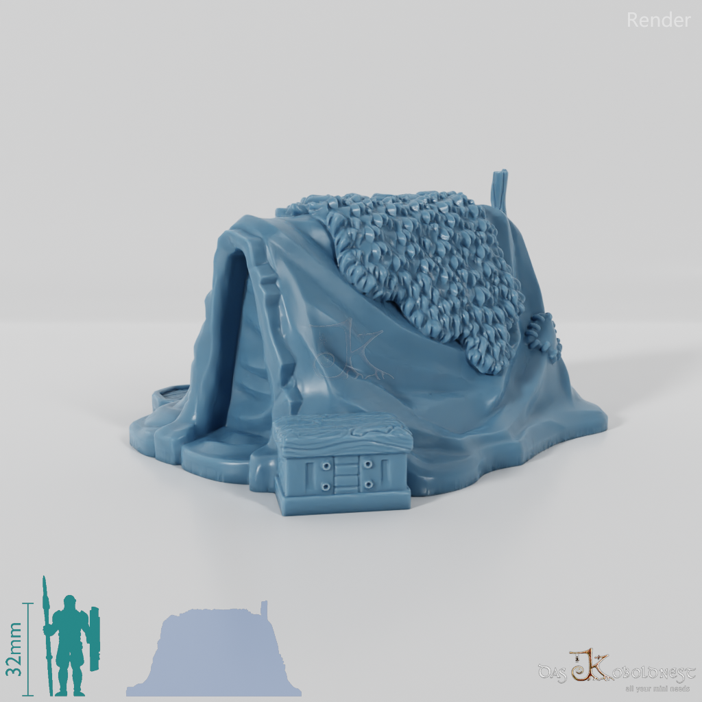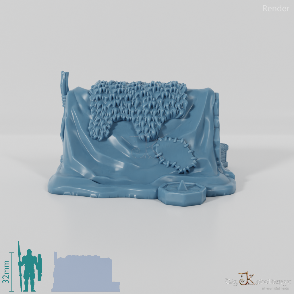 Kleines, mit Fellen abgedecktes Schlafzelt, vor dem eine Kiste steht.