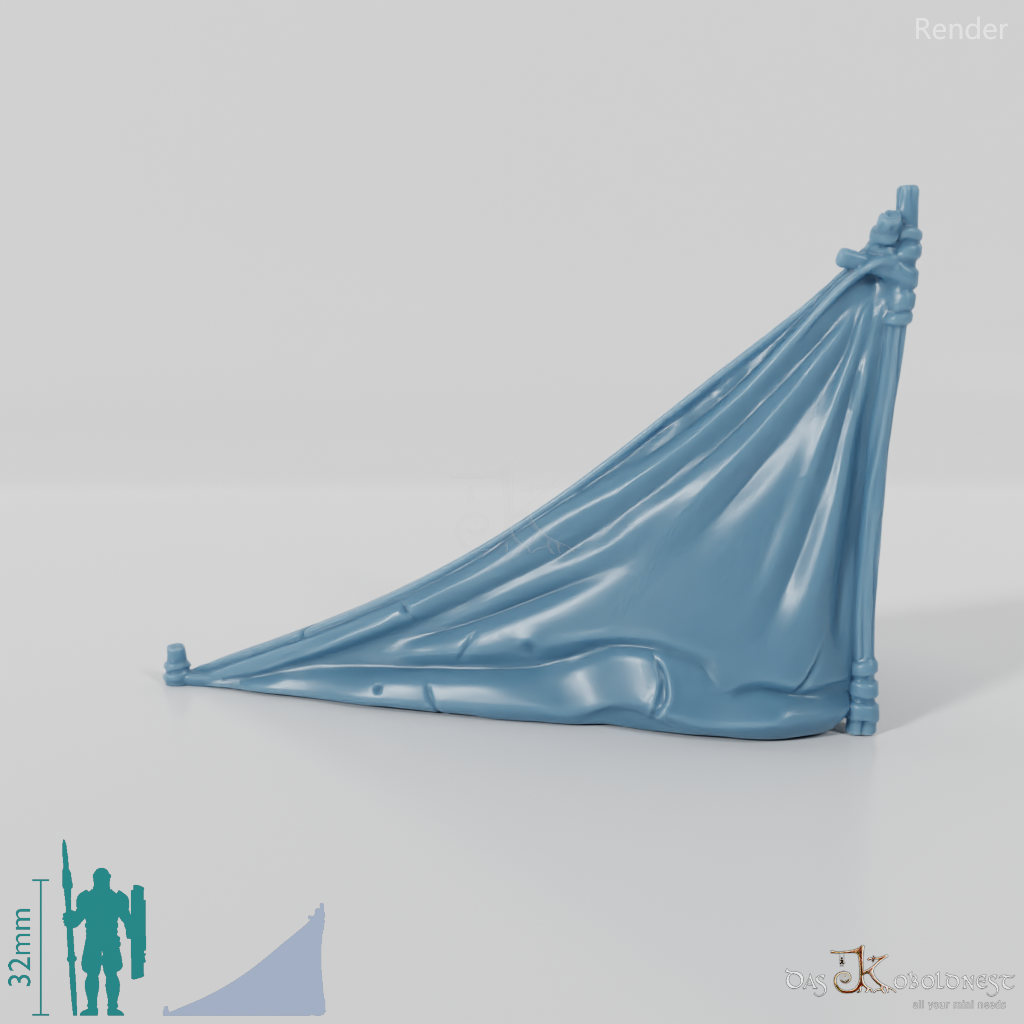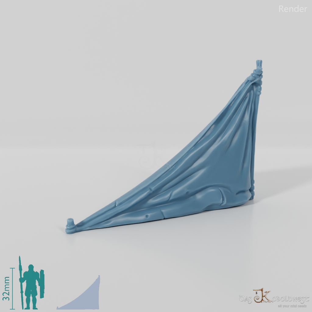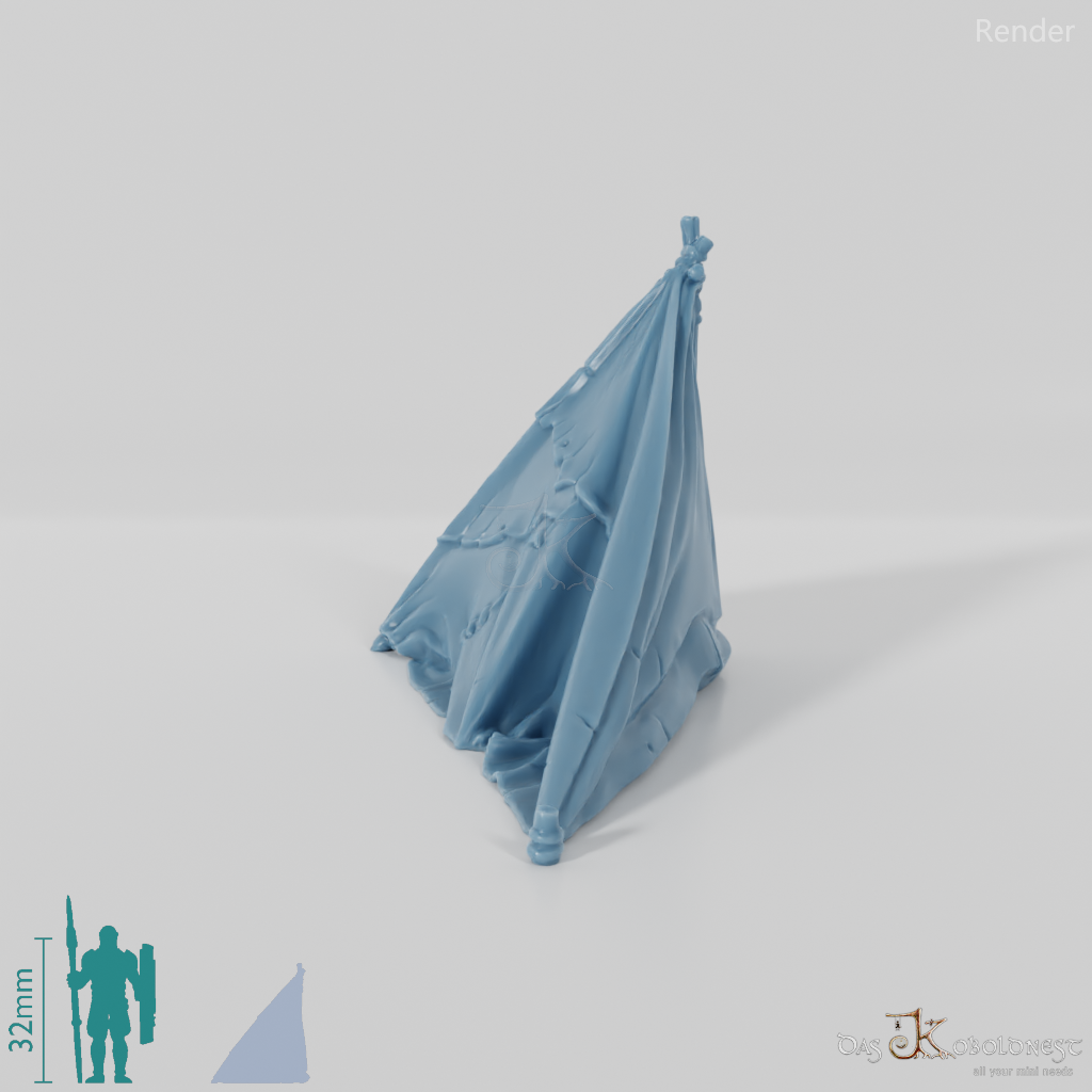 Schräg stehendes, kleines Zelt mit auf dem Boden gespannter Plane, das aus groben Lederstücken genäht ist