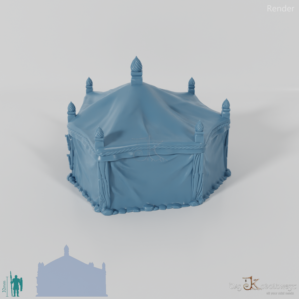 Unregelmäßiges, sechseckiges Zelt mit offenem Eingang und kleinen, gedrehten Verzierungen auf den Ecken