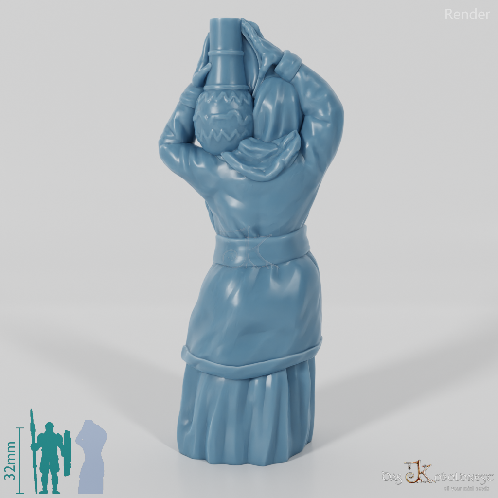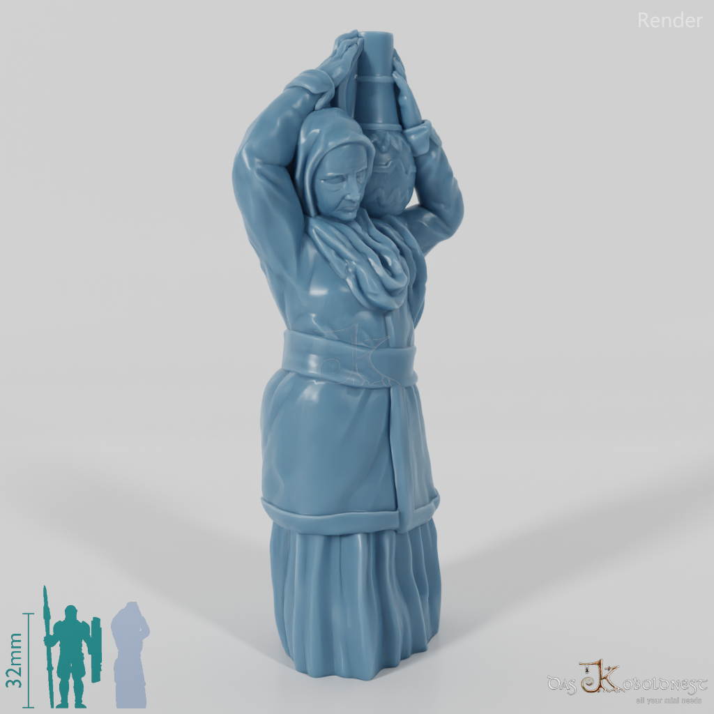 Alte Frau mit Kopftuch in langem Kleid, die  eine große Amphore auf der Schulter trägt.