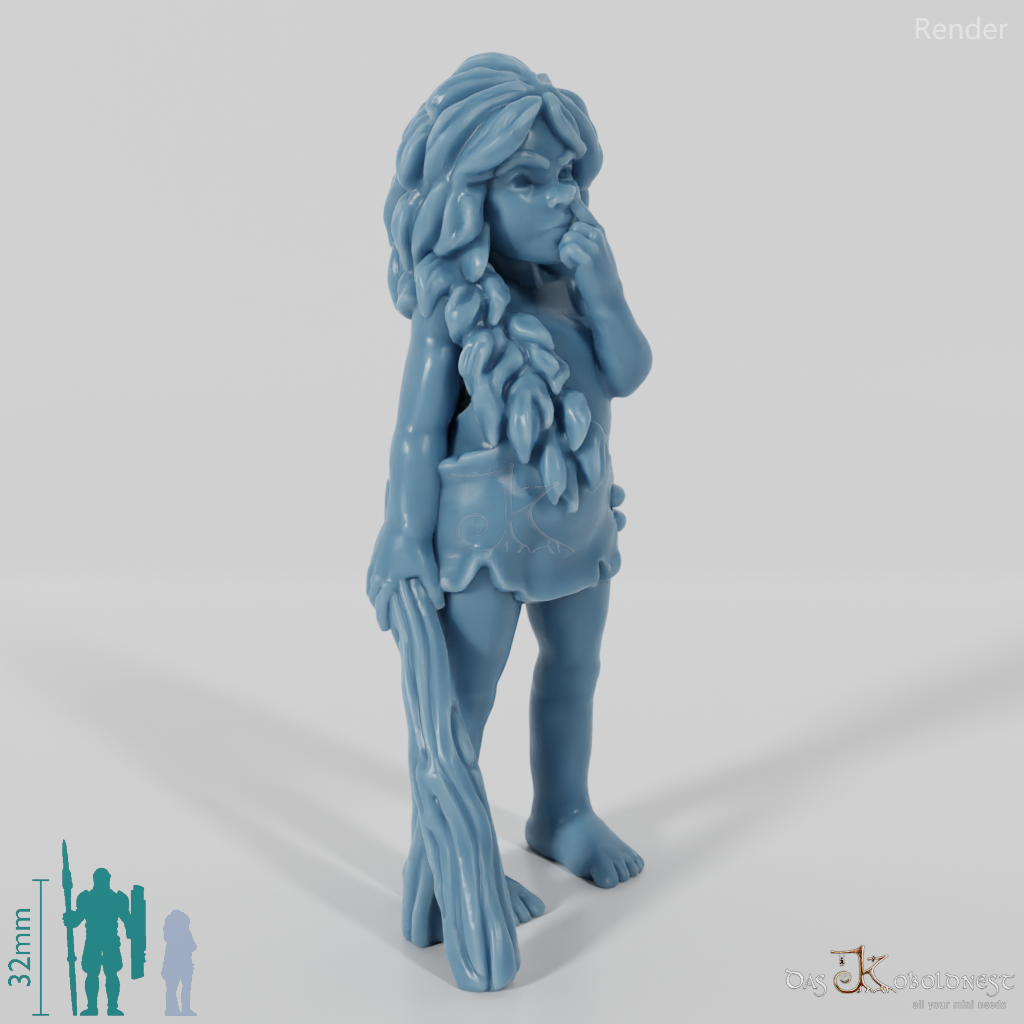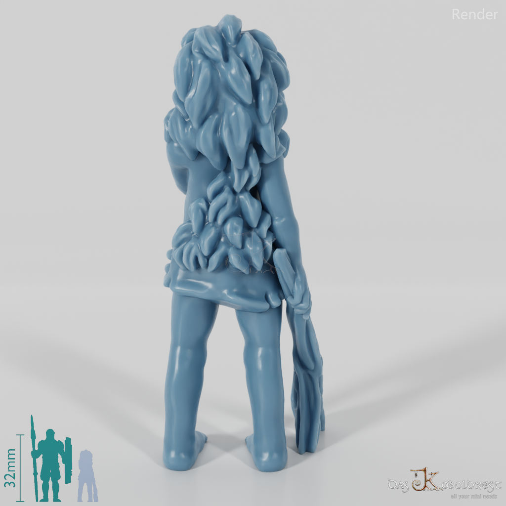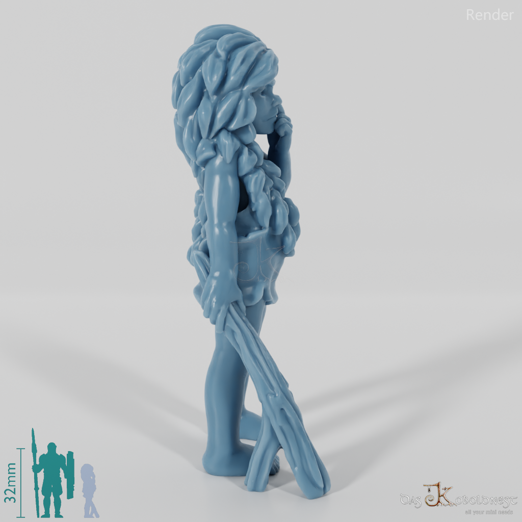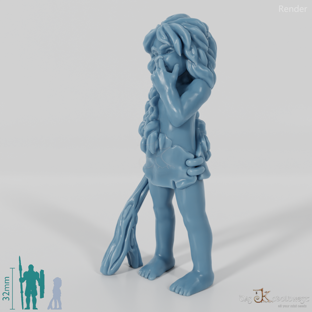 Kind mit zottigen Haaren und einfacher Felltunika, das eine Keule trägt und in der Nase bohrt