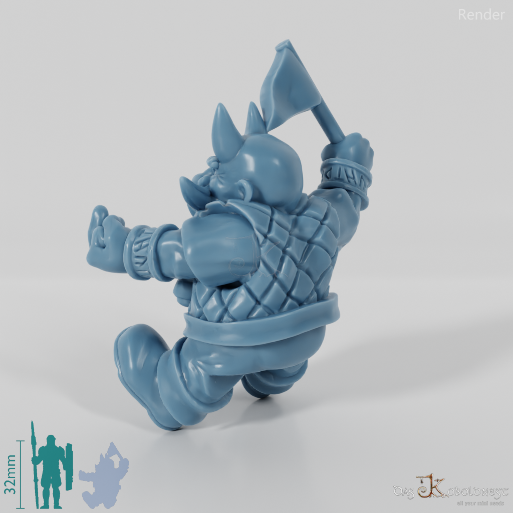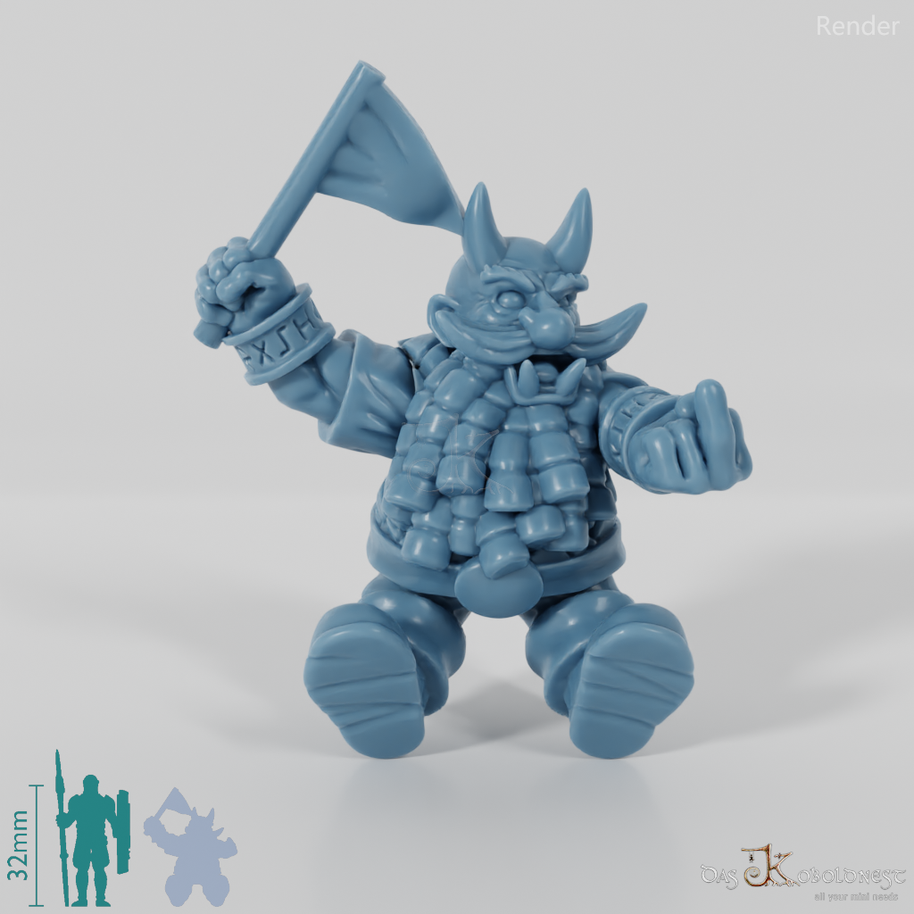 Sitzender Zwerg mit spitzen Hörnern, der den Mittelfinger erhoben hat und ein Fähnchen in der anderen Hand hält. Modell sitzt nicht von alleine, sondern benötigt eine Bank oder Ähnliches zum platzieren.