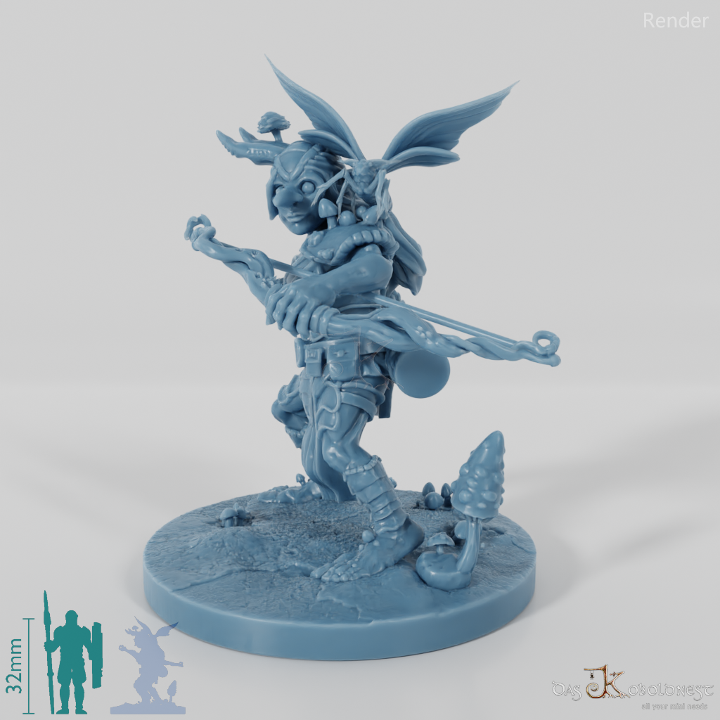 Mo'da Höhlenzwergin mit pilzbewachsener Rüstung und knorrigem Bogen, die von einem großen Nachtfalter begleitet wird. Modell steht fest auf szenischer 25 mm-Rundbase und wird daher nicht in unterschiedlichen Maßstäben angeboten