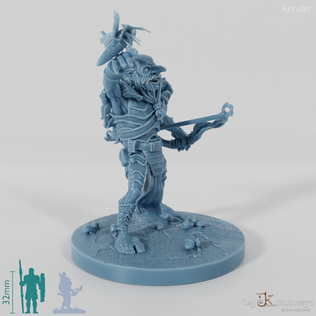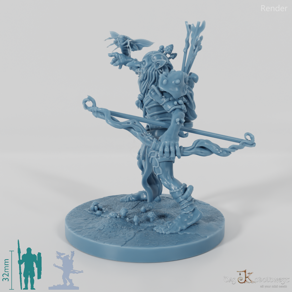 Mo'da Höhlenzwerg mit pilzbewachsener Rüstung und knorrigem Bogen, der von einem großen Nachtfalter begleitet wird. Modell steht fest auf szenischer 25 mm-Rundbase und wird daher nicht in unterschiedlichen Maßstäben angeboten