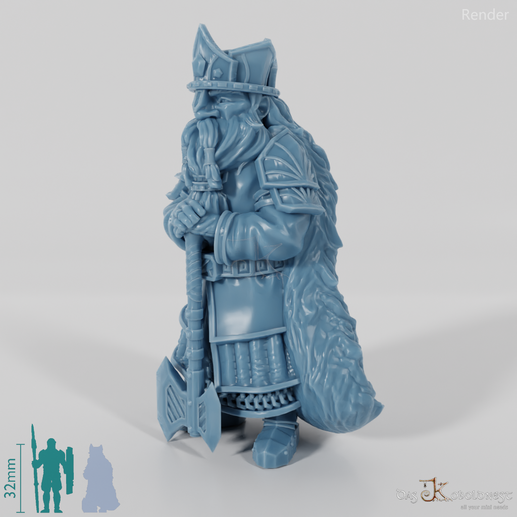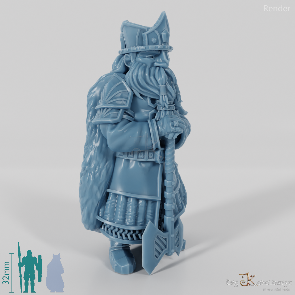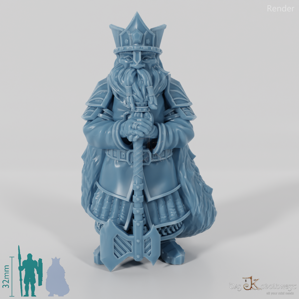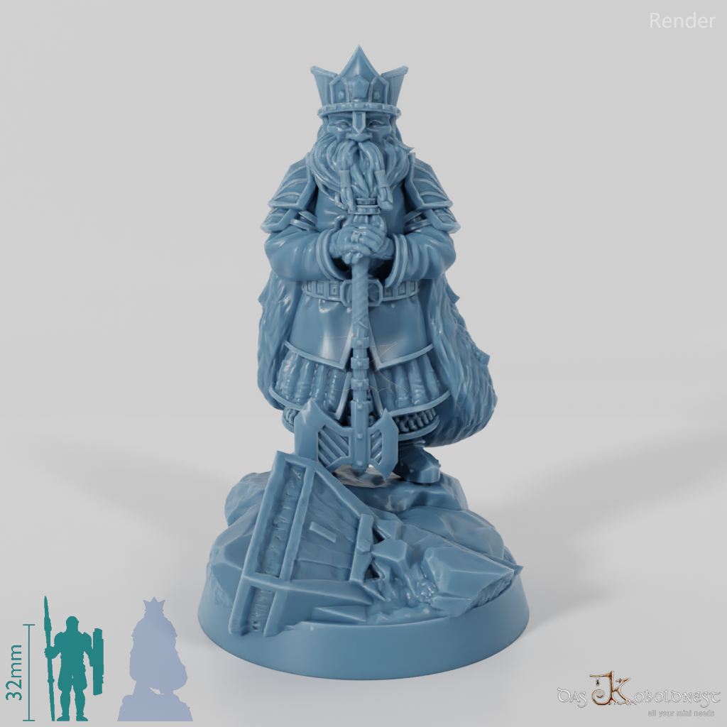 Bärtiger Zwerg in Rüstung und edler Kleidung, der sich mit gefalteten Händen auf den Stiel einer Streitaxt stützt und eine juwelenverzierte Krone trägt