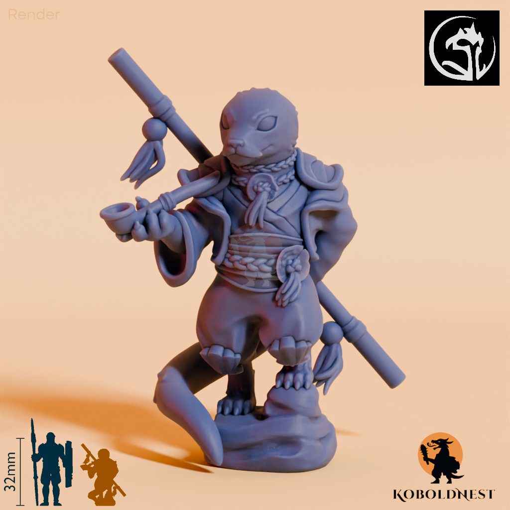 Kleiner Ottervolk-Kampfkünstler mit Pfeife in der Hand und Kampfstab hinter dem Rücken