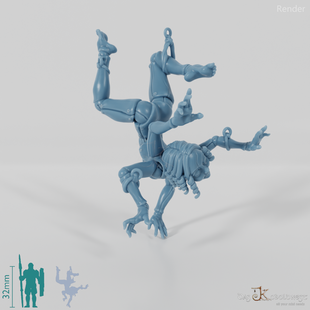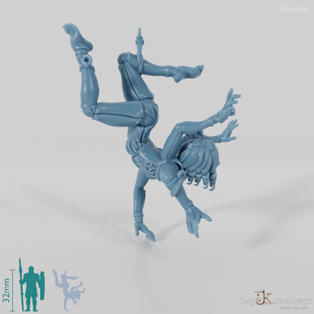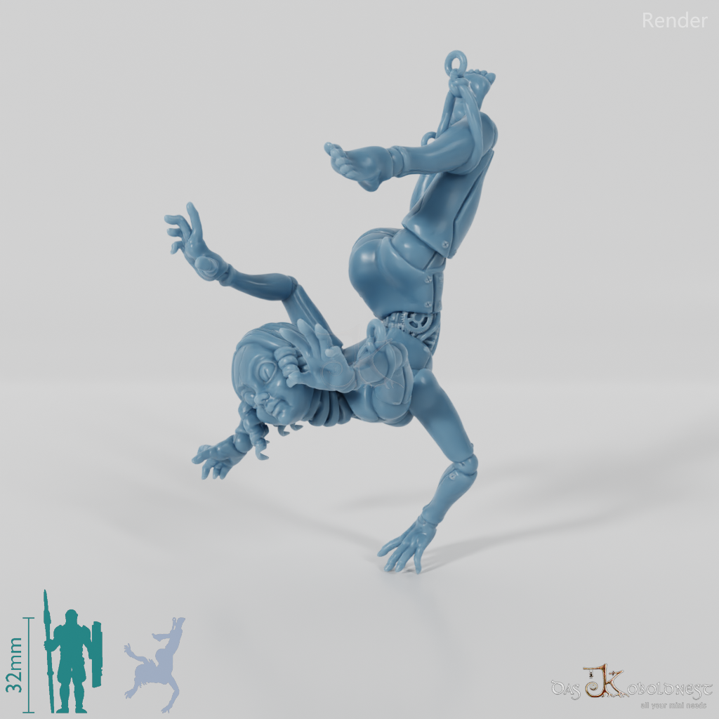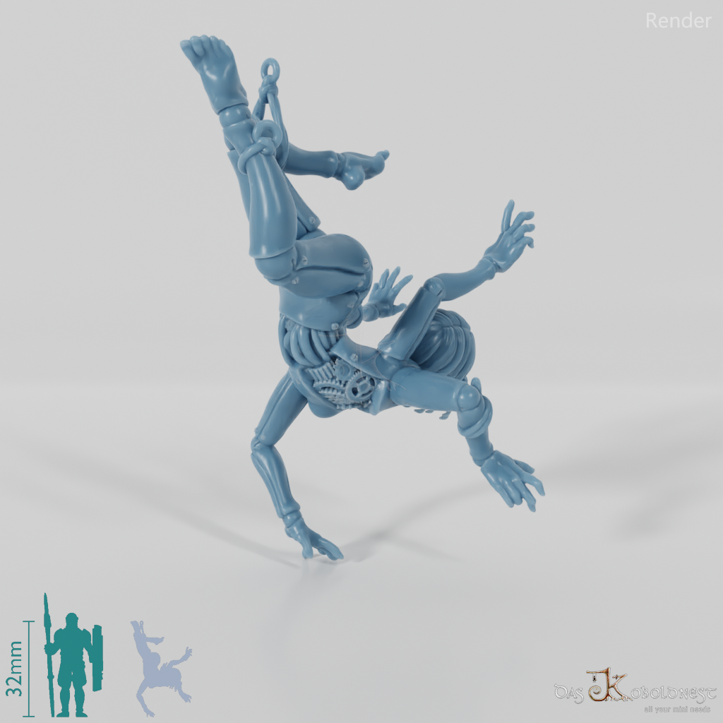 Clockwork construct in the shape of a four-armed girl with curly hair hanging from the ceiling. Model has four eyelets on the limbs from which it can be hung on thin threads.