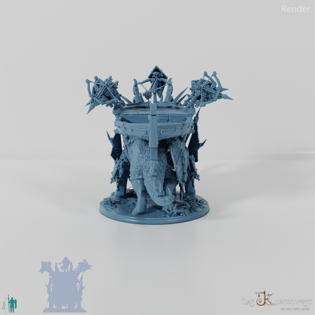 Riesiger Dinosaurier mit gehörntem Kopf und ausladendem Nackenkamm, der ein umgebautes Schiff mit großen Ballisten auf dem Rücken trägt Modell wahlweise mit oder ohne gestaltete 100mm-Base verfügbar.